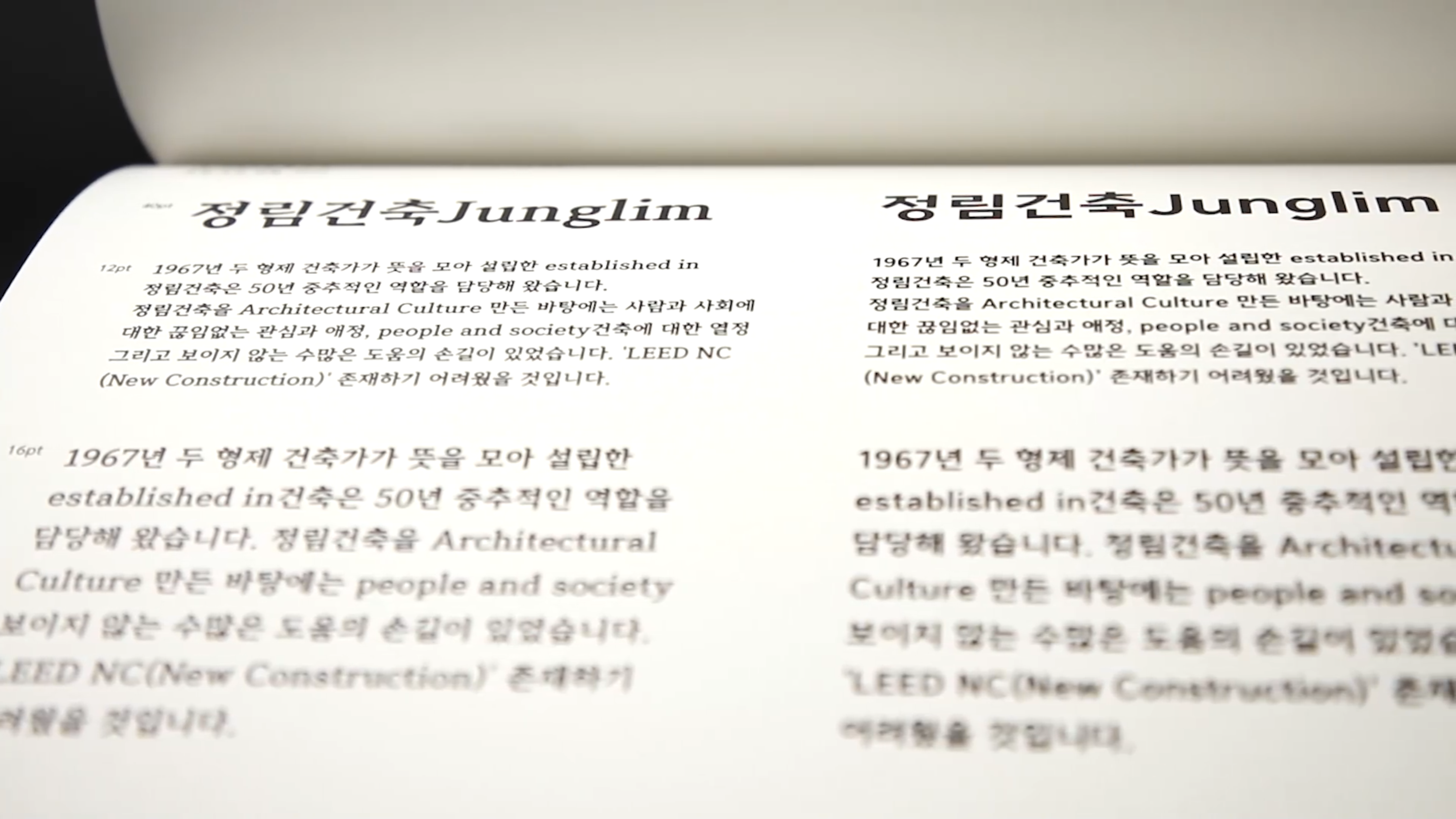 2022년 6월 [김정철 명조]와 [김정철 고딕], 12월 [김정철 손글씨]로 비로소 짓기를 완공한 [정림건축 김정철 서체] 프로젝트. 건축계 안팎의 모든 사용자들이 이 글자를 쓰면서 저마다 자기 마음의 도면을 그리고, 이 글자 안에 내재된 튼실한 ‘자재’와 더불어 소중한 삶의 기록, 무엇보다 자기만의 올곧은 ‘상’을 지어 가기를 바랍니다.