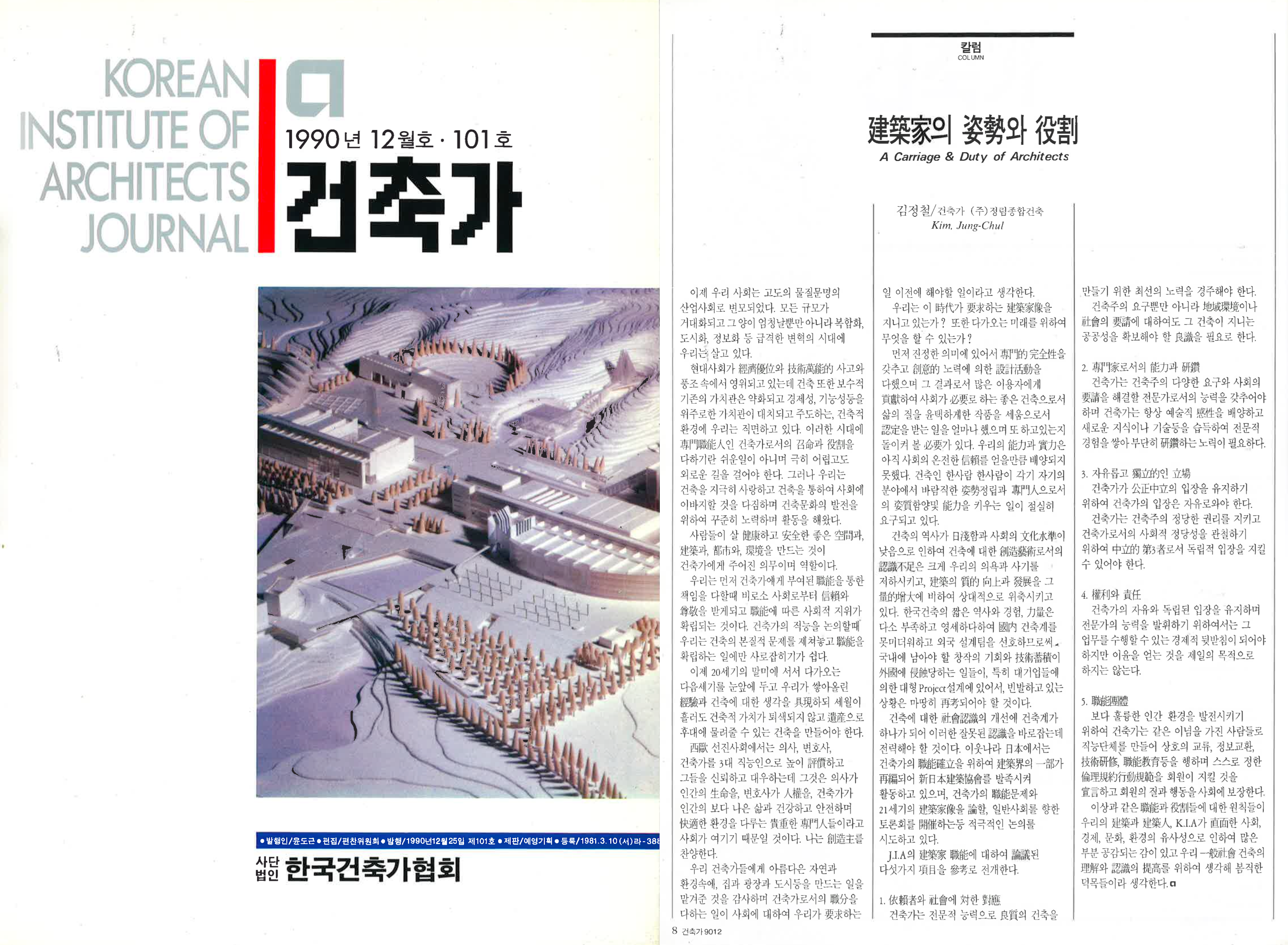 건축가 김정철이 언명한 건축가상이란 “전문적 완전성”과 “창의적 노력에 의한 설계 활동”으로 “사회가 필요로 하는 좋은 건축”, 그러니까 “삶의 질을 윤택하게 한 작품”을 짓는 사람입니다. 비단 건축뿐 아니라 우리 사회의 모든 분야에 적용될 수 있는 인간상이죠. 이러한 사람들이 우리 일상과 사회 곳곳을 채울수록 세상은 보다 살 만한 공간이 될 것입니다. 마치 잘 지어진 건축물처럼요.