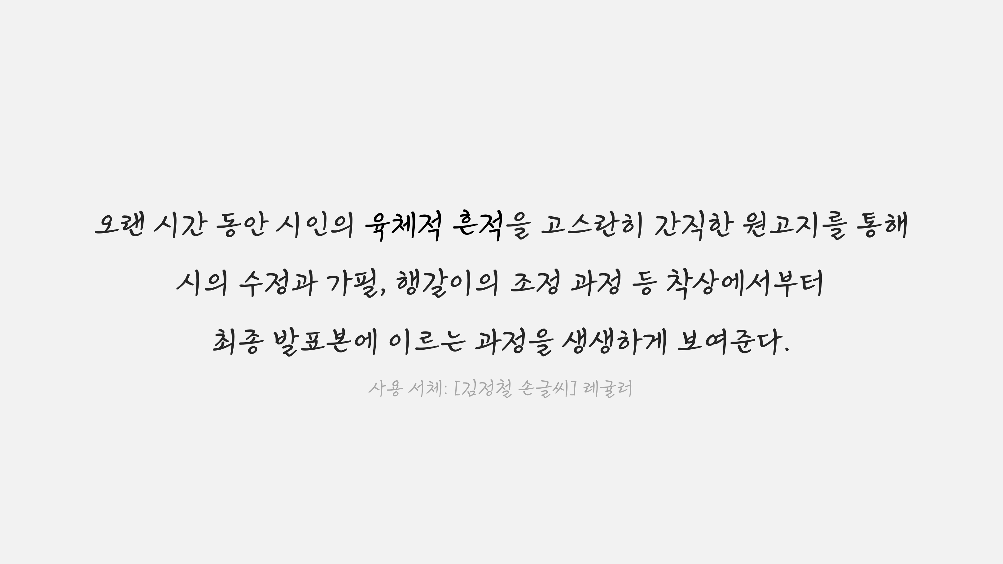 ‘육체적 흔적을 고스란히 간직한’이라는 부분이 눈에 띕니다. 이 표현처럼 누군가의 육필은 그이의 몸의 자취를 머금고 있습니다. 그래서 누군가의 육필은 그이를 기억하는 또 하나의 방식이 될 수 있는 것이죠. 건축가 김정철 선생의 육필 원고와 메모를 디지털 복원한 서체 [김정철 손글씨] 또한 그러합니다.