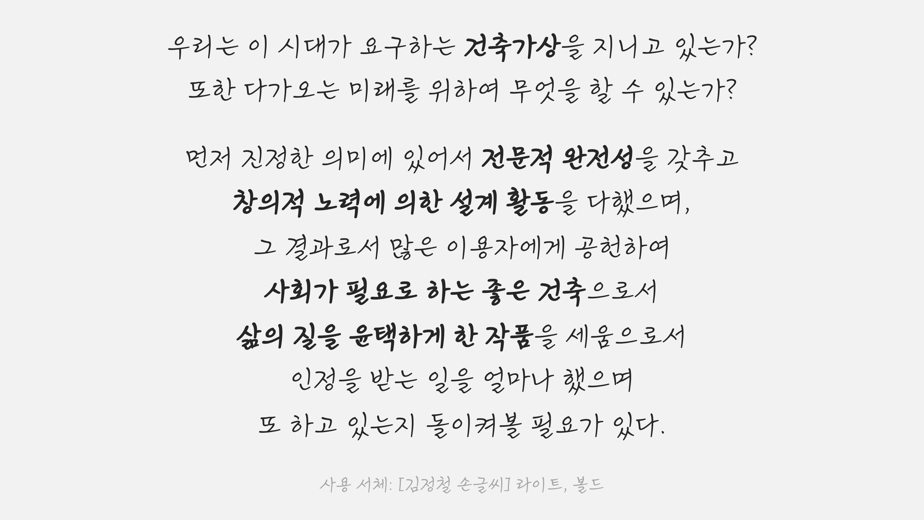 김정철 선생의 이러한 철학, 즉 ‘건축가상-인간상’이야말로 이번 [정림건축 김정철 서체] 프로젝트의 원형이자 정신이라 할 수 있습니다. 이 글자를 사용함으로써 건축인들과 일반 사용자 모두 더 나은 세상을 위한 각자의 ‘상’을 짓기를 바라는 마음. 이 의미를 담은 표어가 바로 ‘건축가의 서체’입니다.