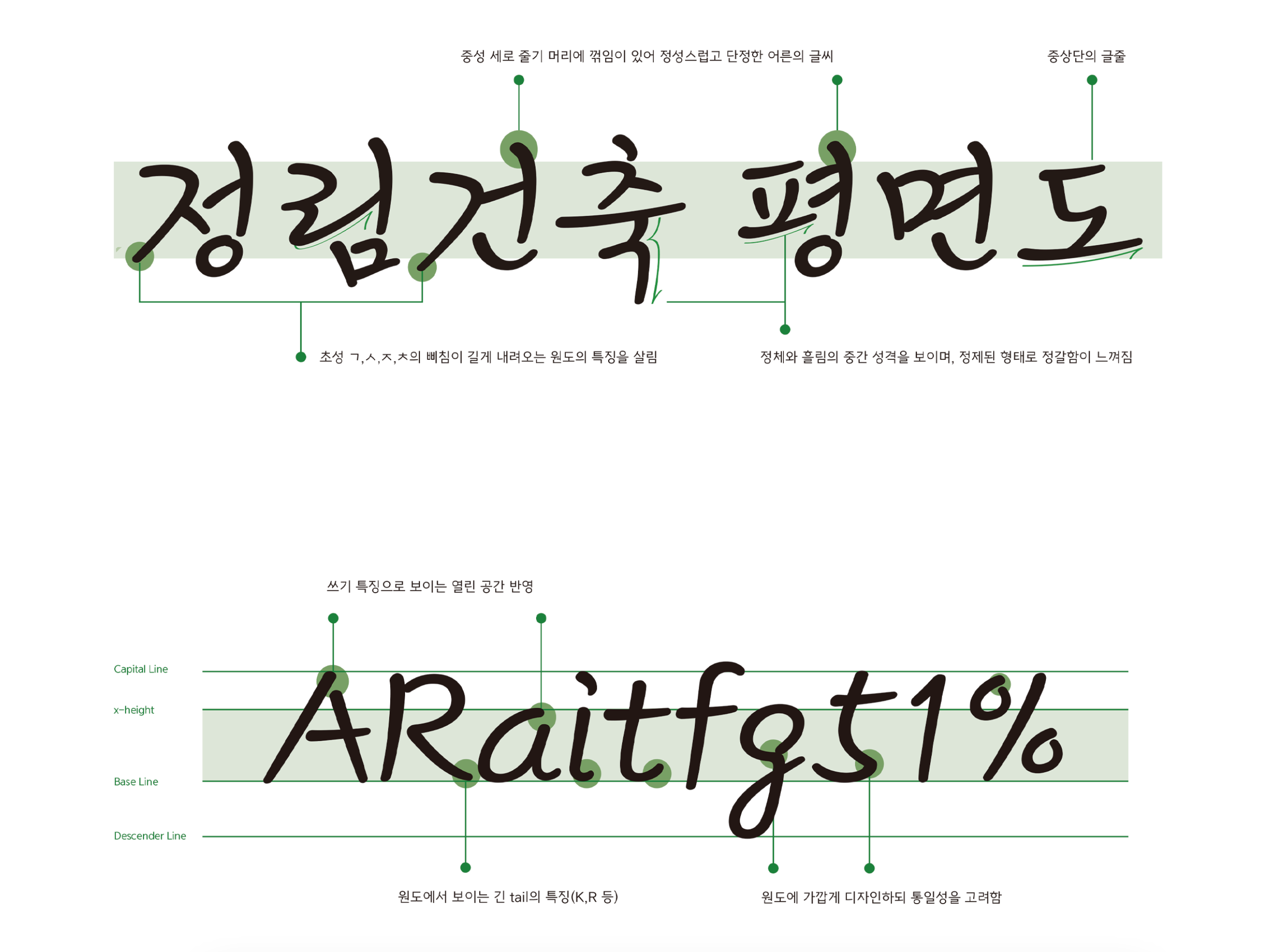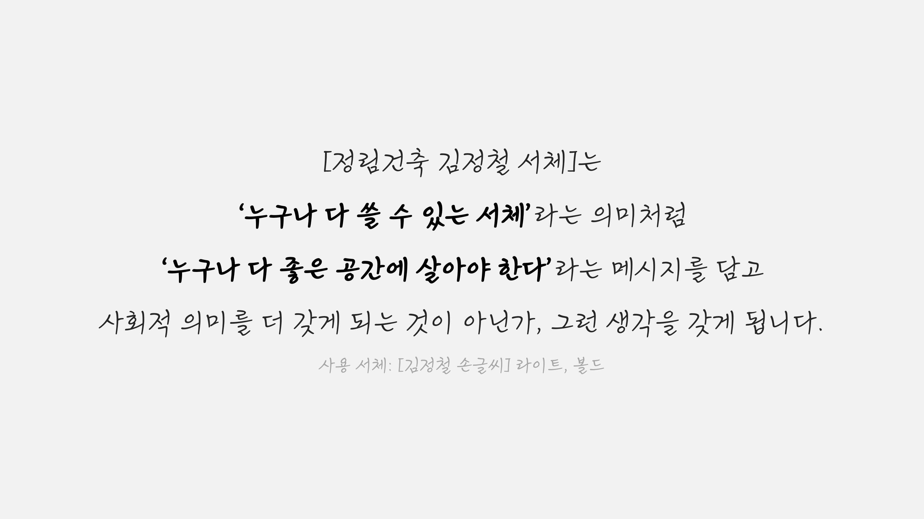 [정림건축 김정철 서체] 프로젝트의 궁극적인 지향점 역시 바로 ‘함께’, ‘숲’이었습니다. 건축 회사가 지은 건물 안에 모든 사람들이 차별 없이 드나들고 머물듯, 건축계 안팎의 많은 사람들이 완성도 높은 서체를 사용하면서 자신만의 글과 기록을 지을 수 있기를 바란 것이죠. 이러한 기획 의도는 건축가 김정철의 평소 소신이자 평생 철학이었고, 이 ‘함께―숲’의 흔적이 가장 짙게 묻어난 서체가 바로 [김정철 손글씨]라 할 수 있겠습니다.