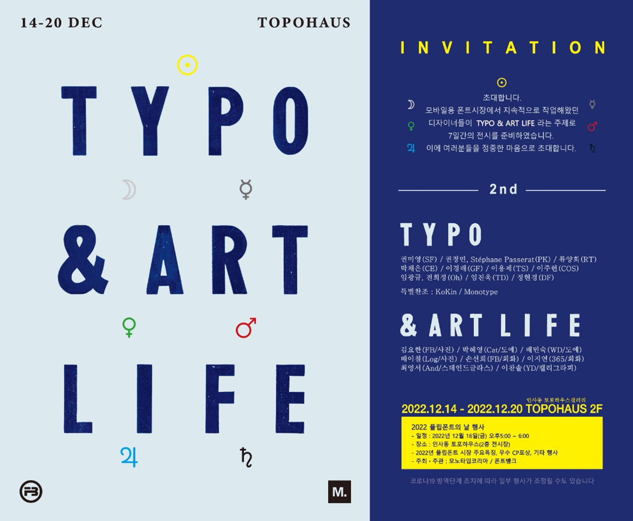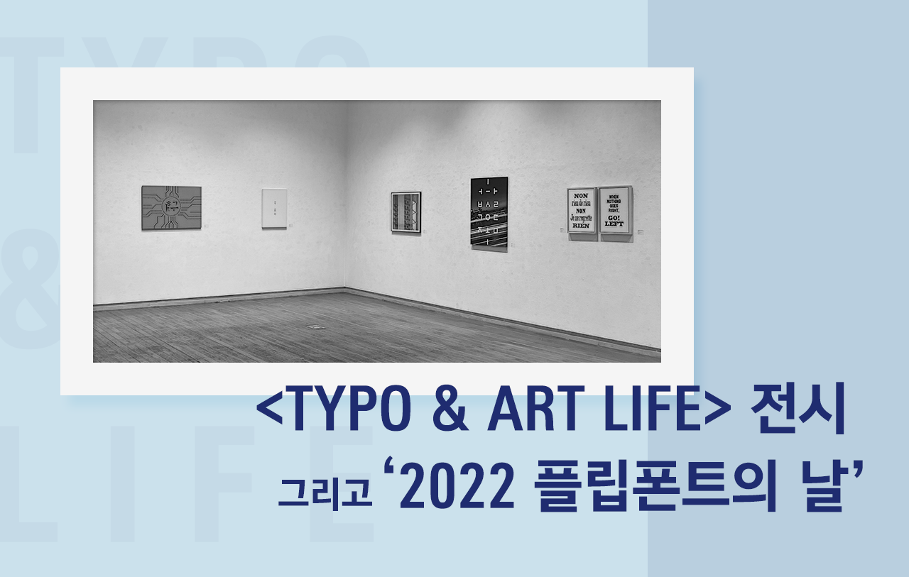이렇듯 모바일용 폰트, 플립폰트를 만들며 보낸 2022년을 정리하고 기념하는 자리가 지난 12월에 서울 종로구 인사동 ‘토포하우스 갤러리’에서 열렸습니다. 플립폰트를 작업해왔던 디자이너들이 참여한 <TYPO & ART LIFE> 전시와 ‘2022 플립폰트의 날’ 행사입니다. 플립폰트 서비스를 제공하는 모노타입코리아와 폰트뱅크가 주최하고 주관했으며, 윤디자인그룹의 YD플립폰트도 이번 행사와 전시에 참여했습니다.