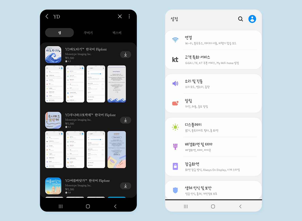 폰트 전문 기업 윤디자인그룹은 아주 당연하게도 플립폰트를 만들어 제공하고 있습니다. 바로 ‘YD플립폰트’(🔗공식 블로그 바로 가기)라는 브랜드인데요, 삼성 갤럭시 스토어에서 ‘YD’를 검색해 찾아보실 수 있어요. 이렇게 플립폰트로 선보인 폰트들을 구독형 폰트 서비스 ‘윤멤버십 톡톡’(🔗폰코에서 자세히 보기)으로 PC에서도 사용할 수 있도록 제공하고 있기도 하고요.