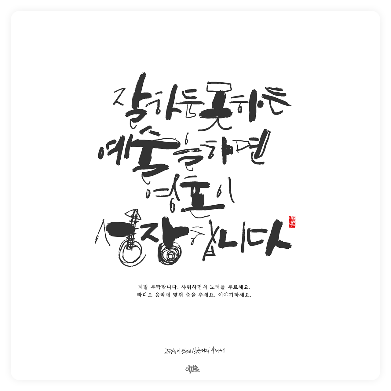 이번 작품은 책 「그래, 이 맛에 사는 거지」 중에 나온 구절로 살기 바빠 예술을 뒷전으로 미룰 수밖에 없는 예술가들을 위로하는 글입니다. 글씨를 두께, 형태, 대비 등 다양한 획으로 구성해 노래를 부르는 것도, 춤을 추는 것도, 이야기하는 것도 큰 것부터 작은 것까지 모두 예술이라는 의미를 담아냈습니다. 글씨의 표현보다 담긴 내용이 좋아 1등에 뽑혔다고 생각해요. 앞으로는 좋은 내용까지 직접 담아낼 수 있는 캘리그라퍼로 성장하겠습니다.