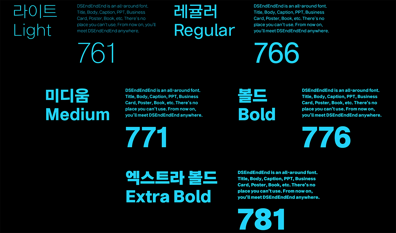 문서, PPT, 명함, 포스터, 책 등 모든 편집물에 본문, 캡션, 제목 등 다양한 용도로 활용할 수 있는, 라이트부터 엑스트라 볼드까지 5종 굵기를 제공하는, 이 모든 걸 충족하며 작업에 마침표를 찍어줄 폰트 「DS 최최최최최종」이 세상에 나왔습니다. 마침내.