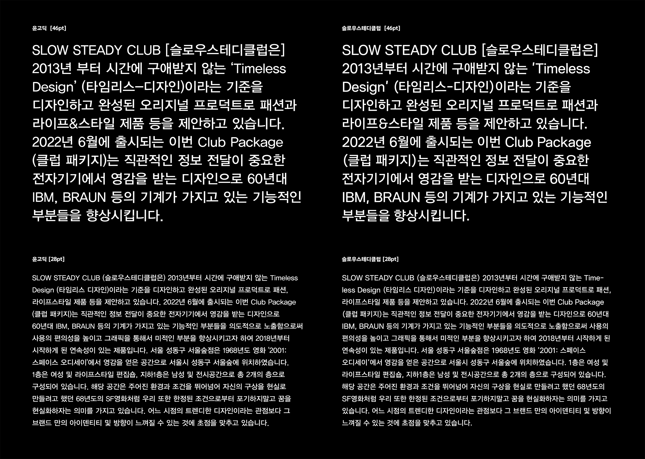 윤고딕은 30년 된 서체지만, 워낙 기본기가 탄탄하고 조형적으로 훌륭해 지금까지도 많이 쓰이며 사랑받고 있어요. 이러한 윤고딕의 탄탄한 조형, 담백한 이미지, 중립적인 인상을 유지하되, 슬로우스테디클럽이라는 브랜드 색깔에 맞춰 재조정했죠. 이 과정에서 특히 디지털 환경에서의 사용성을 최대로 높였습니다.
