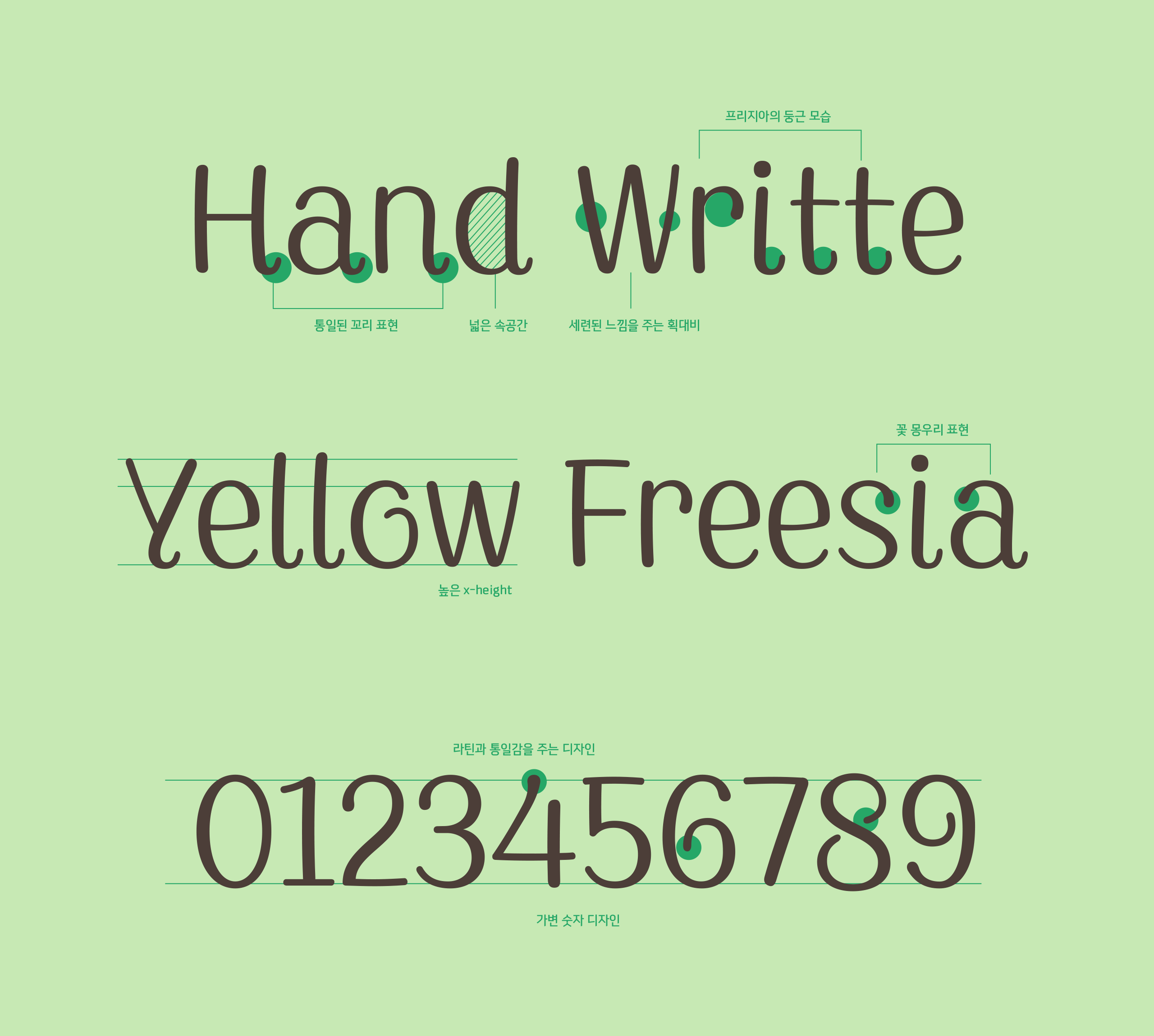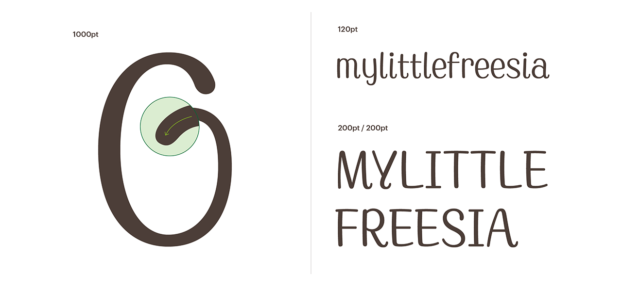 꽃향기 가득한 영문 폰트 MyLittleFreesia는 꼬리 부분을 둥글게 말아 올린 디자인이 특징이에요. 마치 줄기처럼 말이죠. 글자의 인상은 꽃망울처럼 둥글둥글해 이 폰트를 보고 있자면, 마치 프리지아 꽃처럼 보인답니다. 굵고 얇은 획 대비는 세련되고, 전체적으로 귀엽고 부드러운 느낌의 폰트입니다.