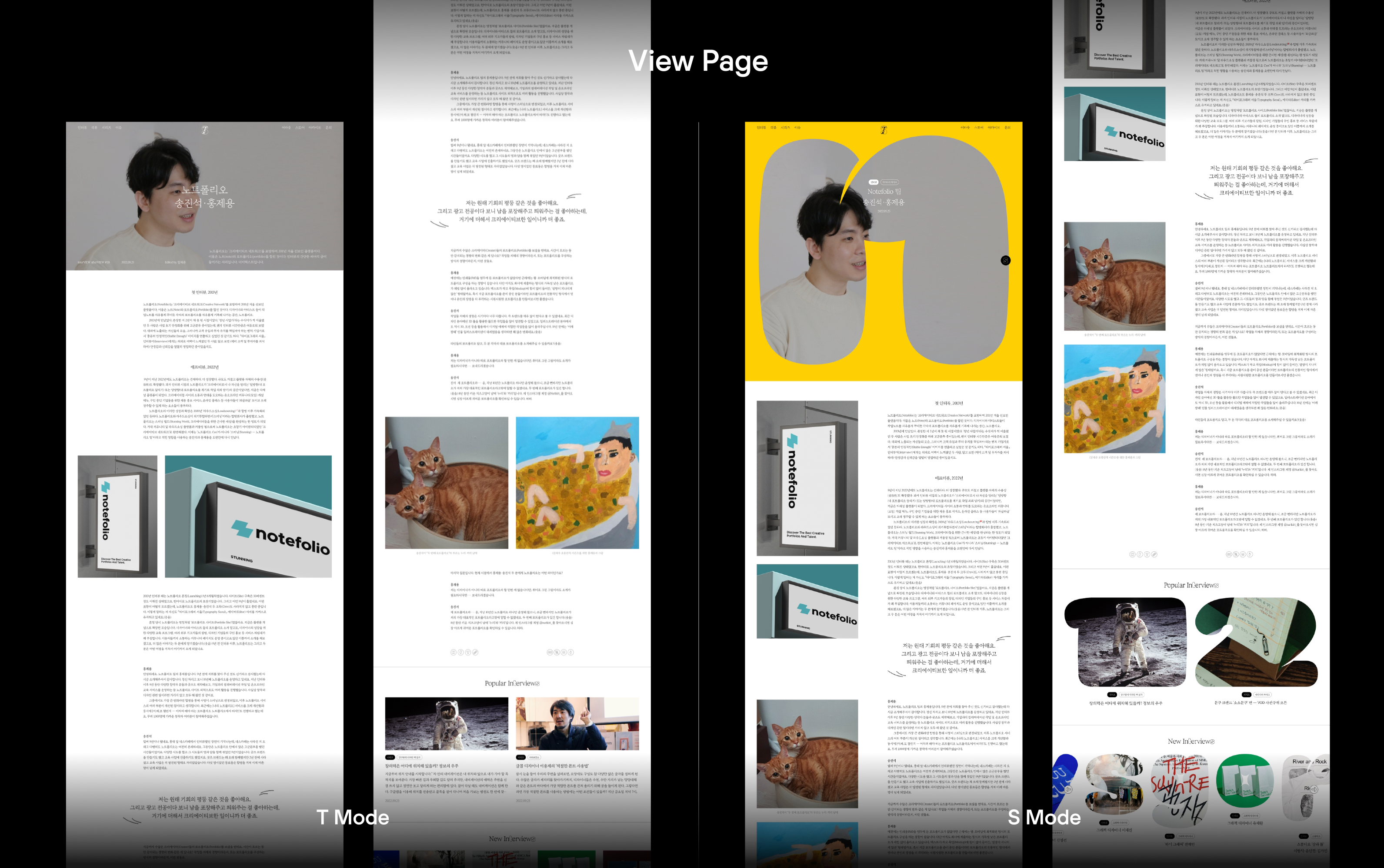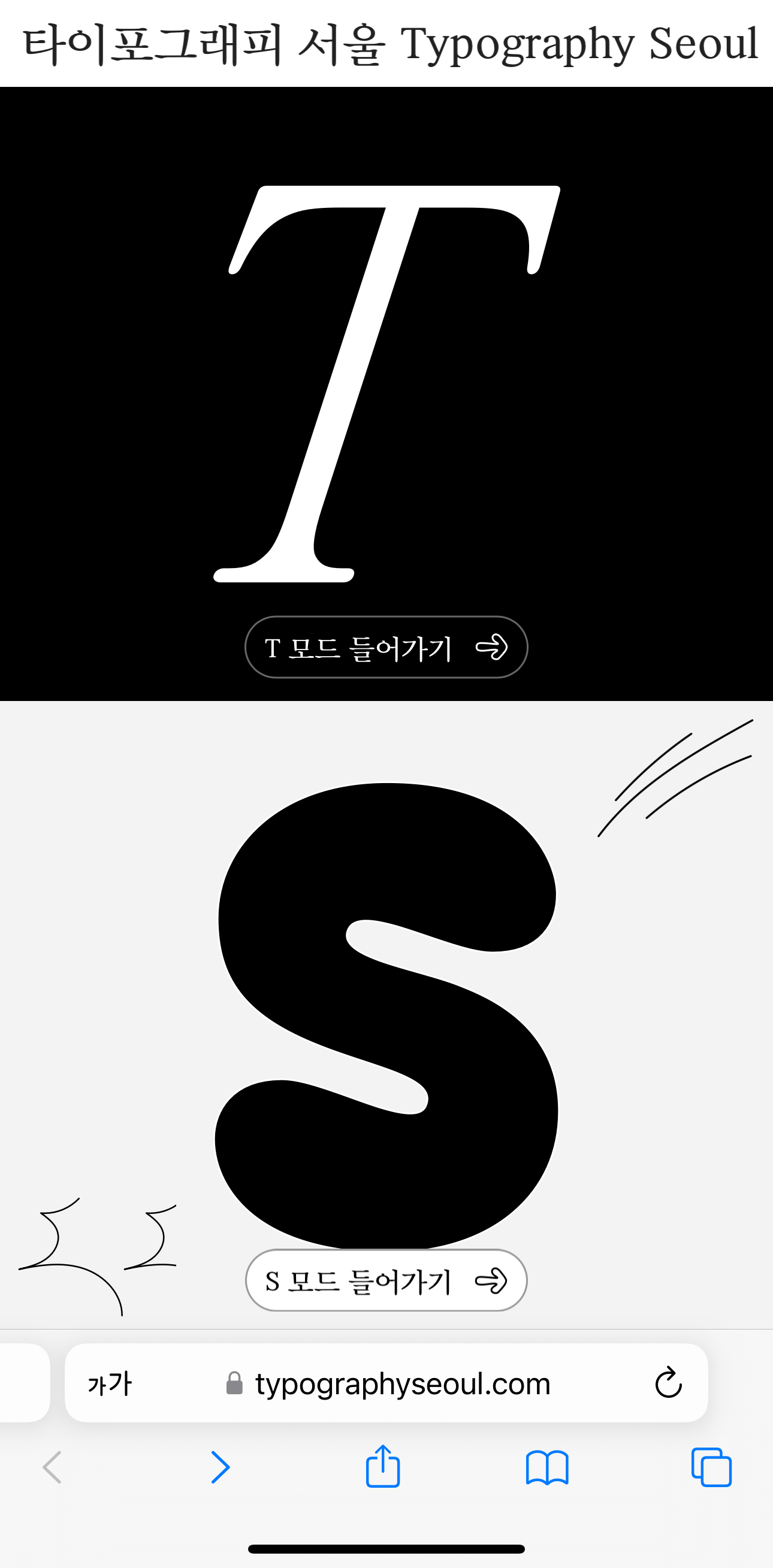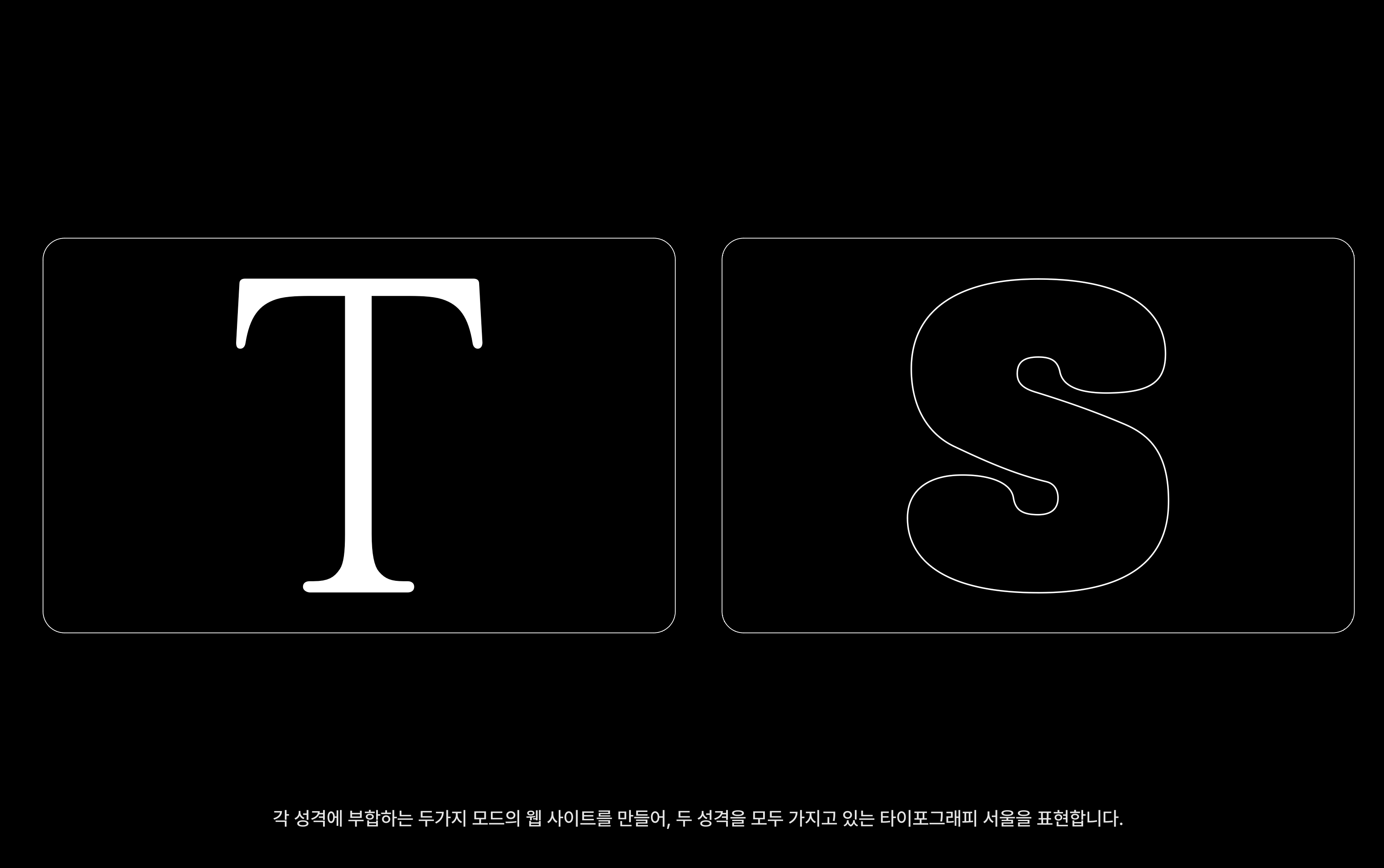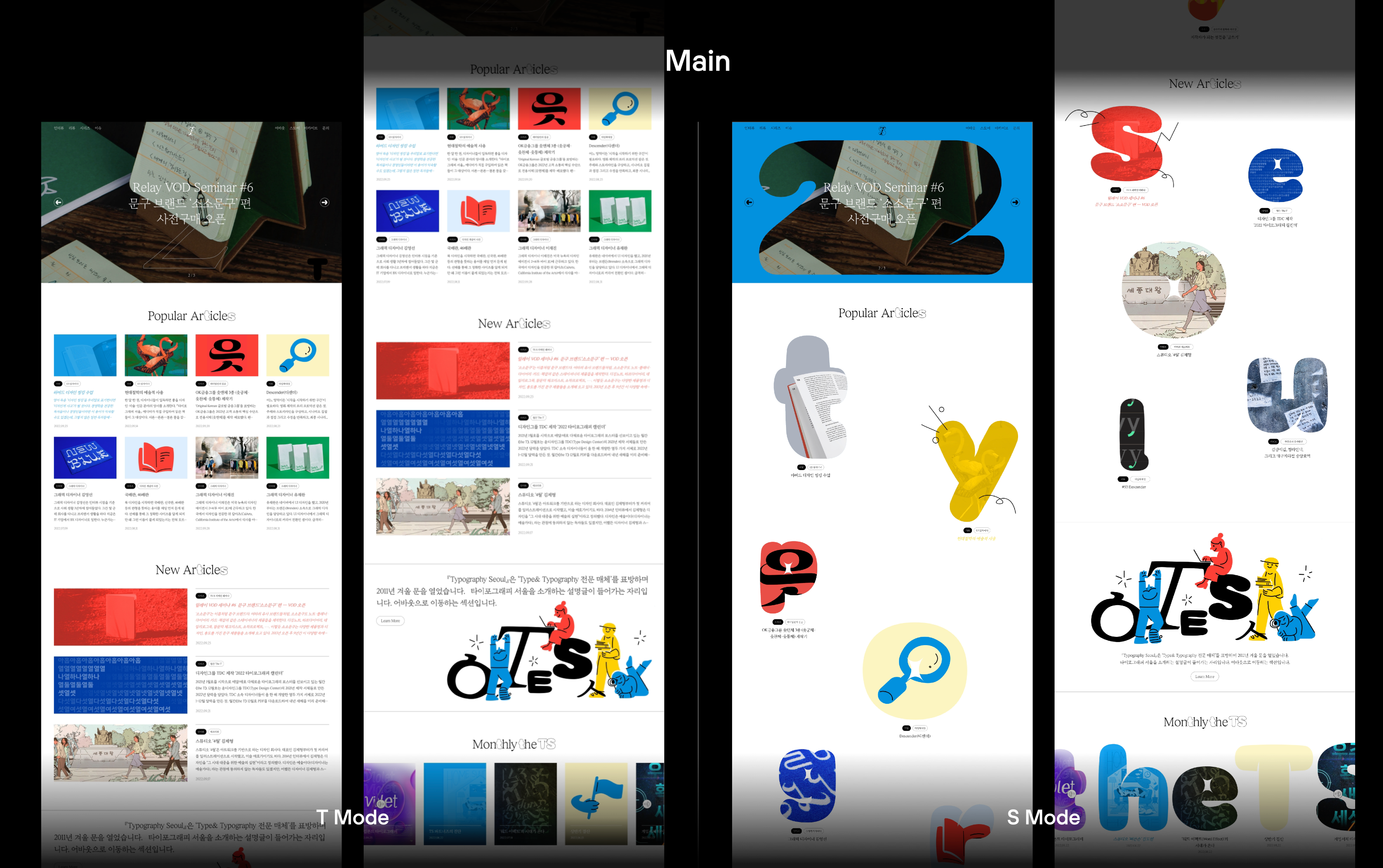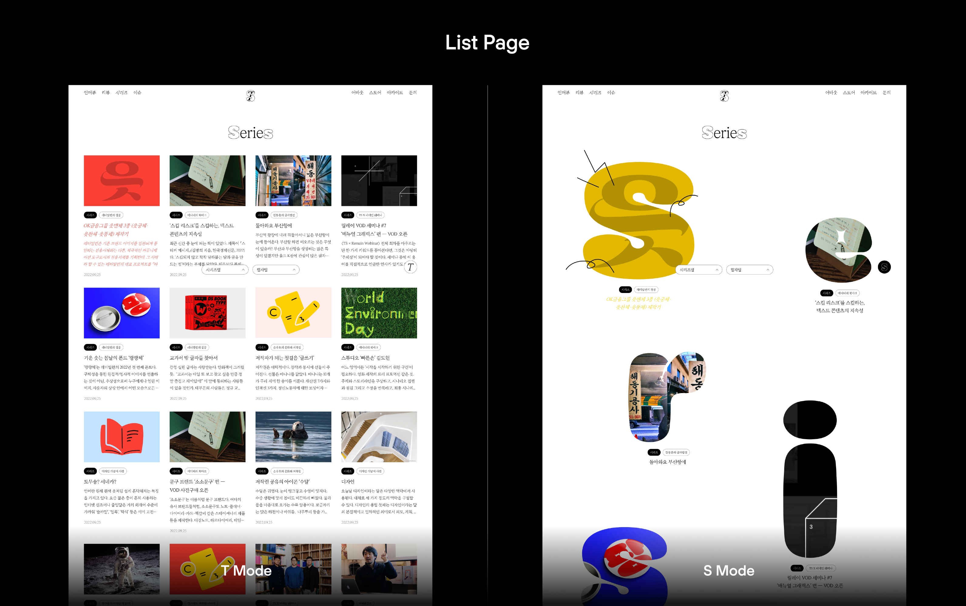 이번 TS 사이트 디자인의 간판이라 할 만한 것이 T/S 모드 전환이다. 인트로, 메인 페이지, 상세 페이지 어디서든 모드 전환 버튼을 눌러 T 모드 또는 S 모드로 사이트를 이용할 수 있다. 리브랜딩과 맥을 같이하는 디자인 요소다. T/S 모드 전환은 매뉴얼 그래픽스의 제안이었다. 킥오프 인터뷰 때 TS 운영진 중 한 명이 농담조로 던졌던 말을 진지하게 받아준 것이 아닌가 싶다.