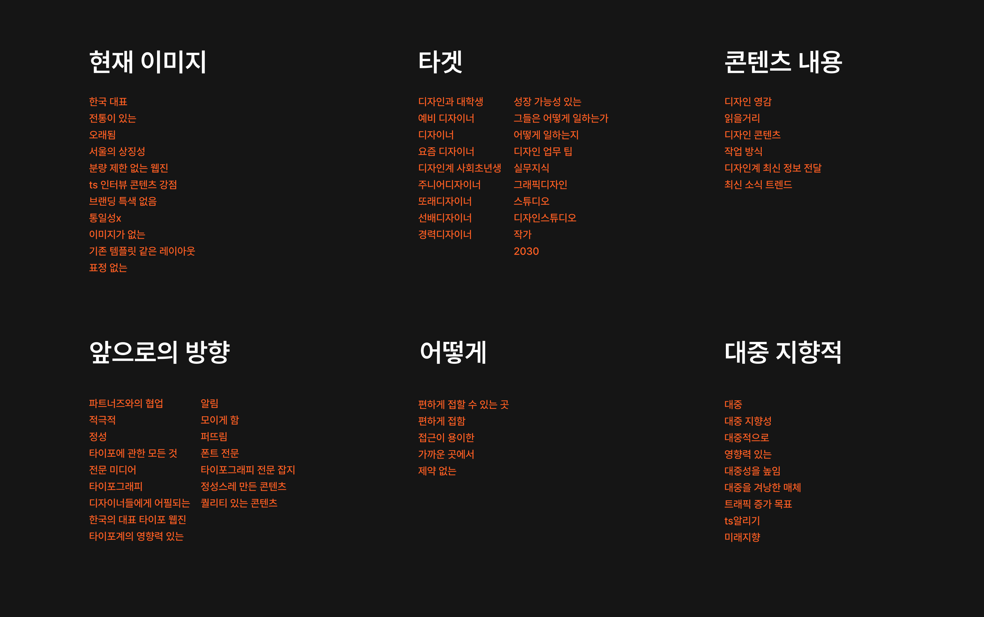 요컨대 브랜드 분석은 킥오프 미팅 때 진행한 심층 인터뷰(매뉴얼 그래픽스가 TS 운영진을 인터뷰했다)와 기초 자료, 그리고 매뉴얼 그래픽스의 내부 학습 결과를 총체적으로 포괄하여 이루어졌다. 아래 내용은 매뉴얼 그래픽스가 작성한 ‘TS 브랜드 분석’ 문서의 일부다.