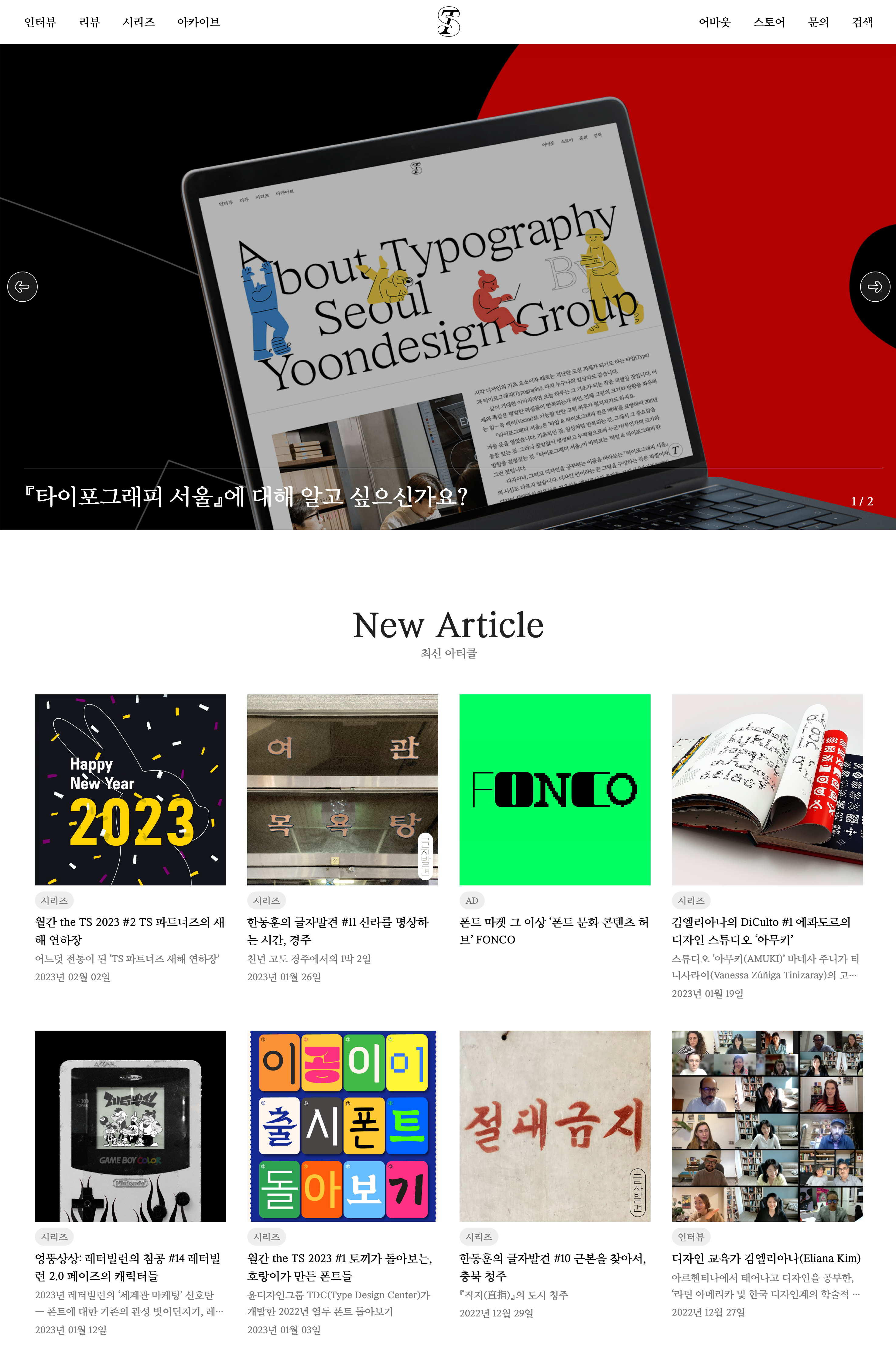 윤디자인그룹이 운영하는 『타이포그래피 서울』(TS, typographyseoul.com)이 리브랜딩을 진행했습니다. 2011년 겨울 문을 연 TS는 ‘타입·타이포그래피 전문 온라인 매체’를 표방하며 10년 넘게 독자 여러분과 만나고 있는데요. 국내외 디자이너와 스튜디오 인터뷰, 흥미로운 디자인 이야기 등 지금까지 1,500건에 달하는 콘텐츠가 축적된 매체입니다.