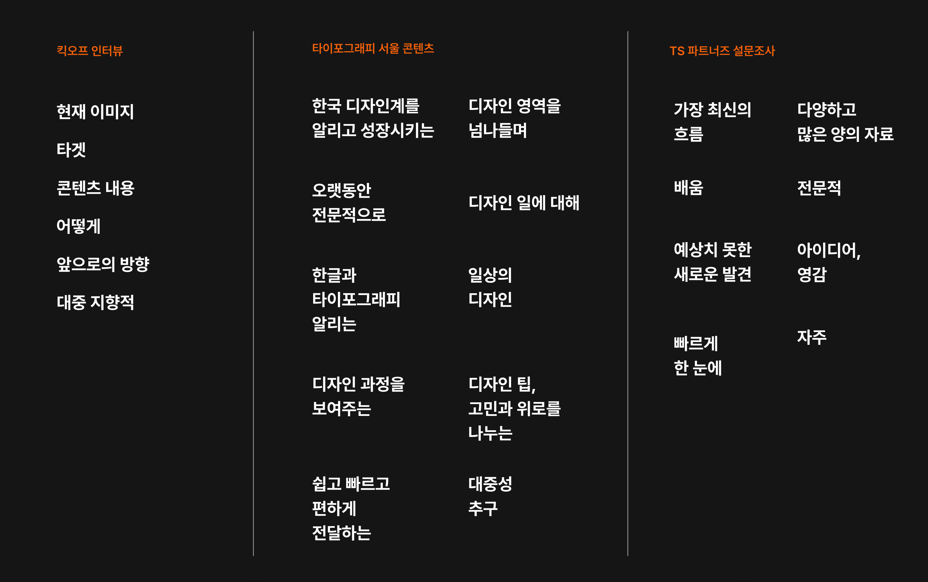 이번 리브랜딩을 진행하는 동안 ‘TS 편집 매뉴얼’ 또한 버전업이 시급함을 절감했다. 1,500건가량 되는 모든 콘텐츠들을 하나하나 들여다보니, 문장 부호가 불규칙적으로 쓰인 사례들―전시 제목 표기 시 작은따옴표(‘’), 큰따옴표(“”), 홑낫표(「」), 화살괄호(〈〉)가 혼용된 것과 같은 사례들을 적잖게 발견했다.