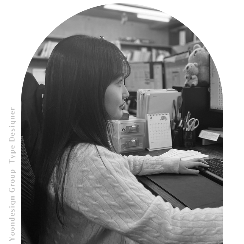 시리즈명이 [글자-마음 보기집]이고 ‘디자이너 인터뷰’를 표방하지만, 디자인 직종 외의 직원들도 이 시리즈에 (자주는 아니겠지만) 등장할 예정입니다. 윤디자인그룹이 글자를 근간으로 하는 기업인 만큼, 디자이너가 아닌 많은 직원들도 결국은 글자와 직간접적으로 연결되어 각자의 직무를 수행합니다. 즉, 그들의 ‘마음’과 ‘결’ 또한 [글자-마음 보기집]에 수록되어야겠지요.