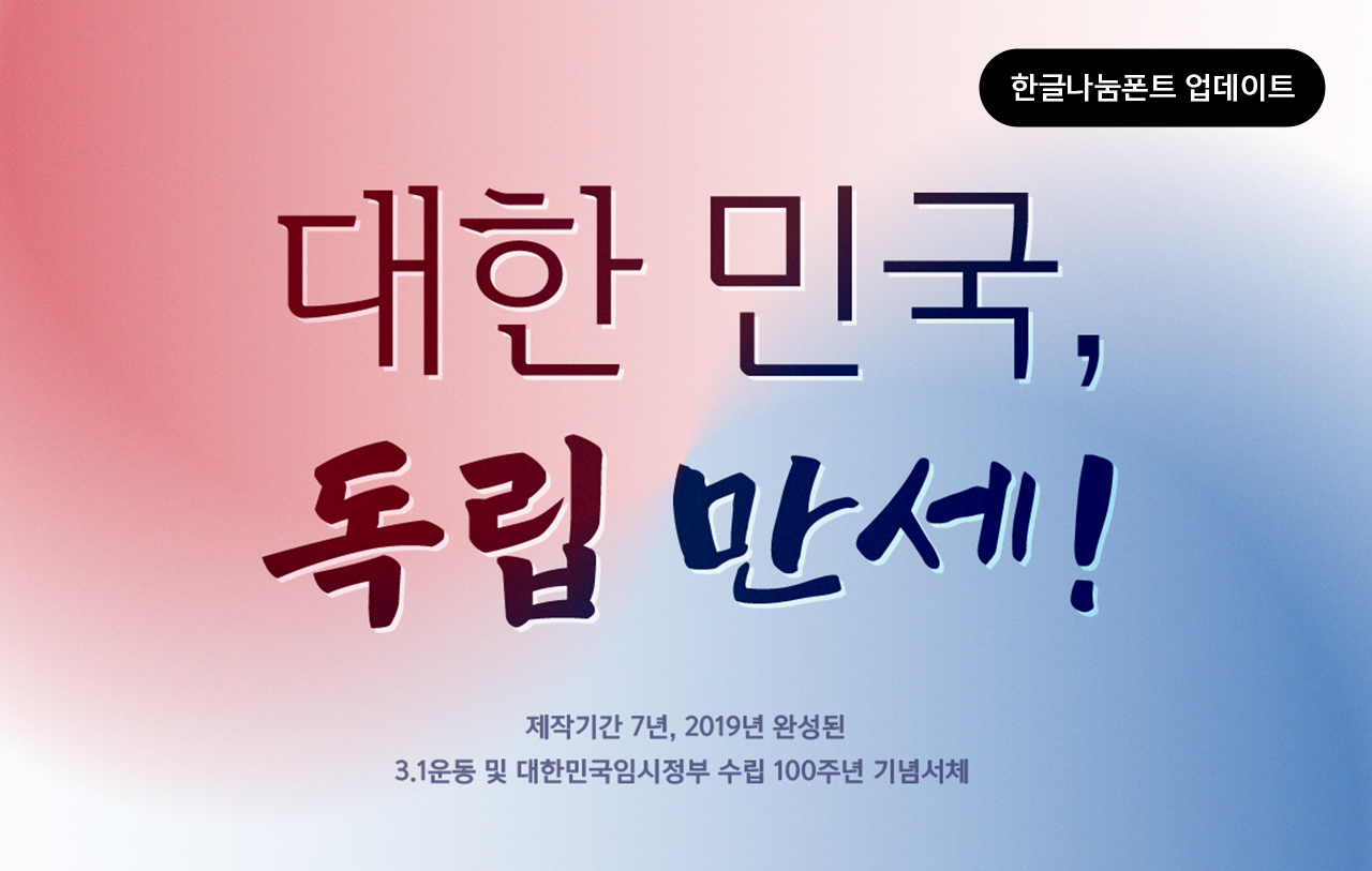 지난 2019년, 윤디자인그룹은 3.1운동 및 대한민국임시정부 수립 100주년 기념서체 ‘대한민국독립만세’를 공개했습니다. 무려 7년의 제작기간 끝에 완성한 폰트 패밀리로 「대한」, 「민국」, 「독립」, 「만세」로 구성되어있죠. 그동안은 별도 마이크로사이트에서 폰트 설치 파일을 다운로드 받아 설치해서 사용해야 했는데요, 이번에 폰코(font.co.kr) 한글나눔폰트에 업데이트되어 보다 간편하게 사용할 수 있게 되었습니다.