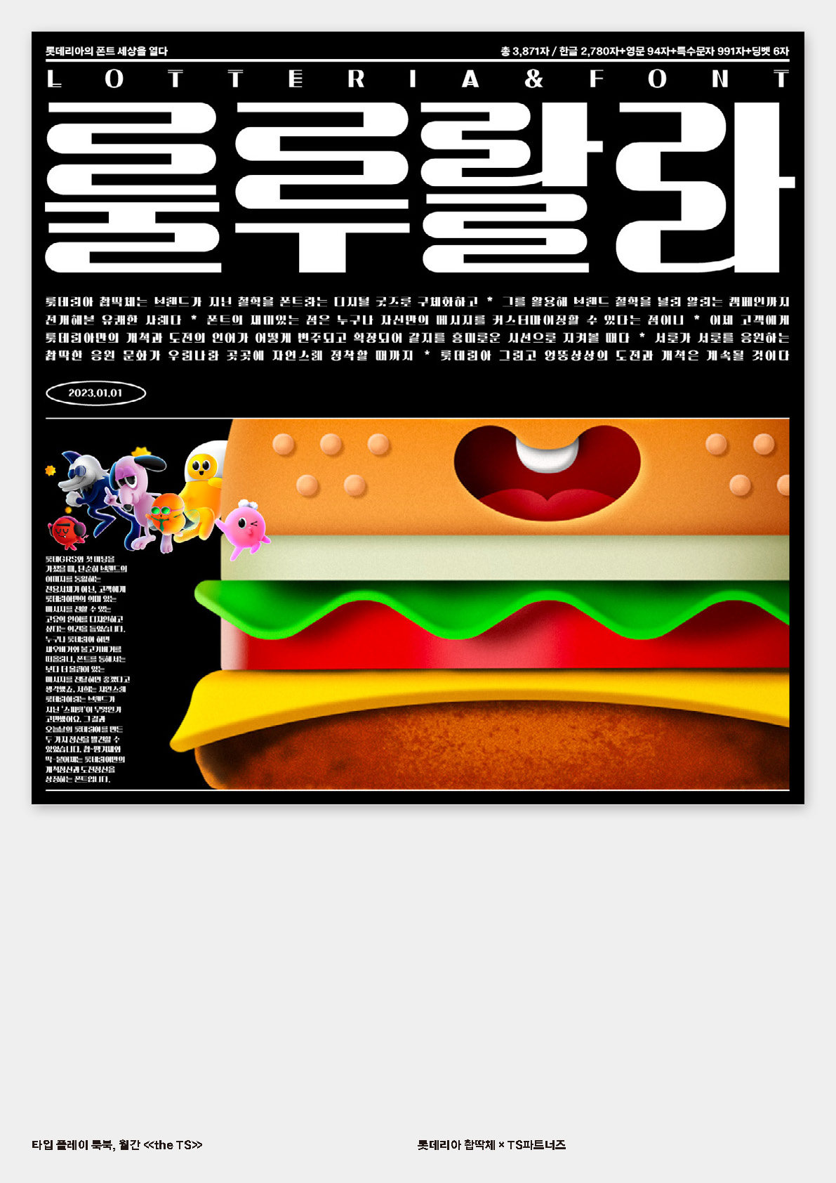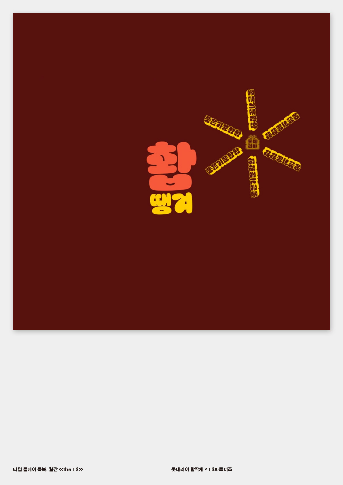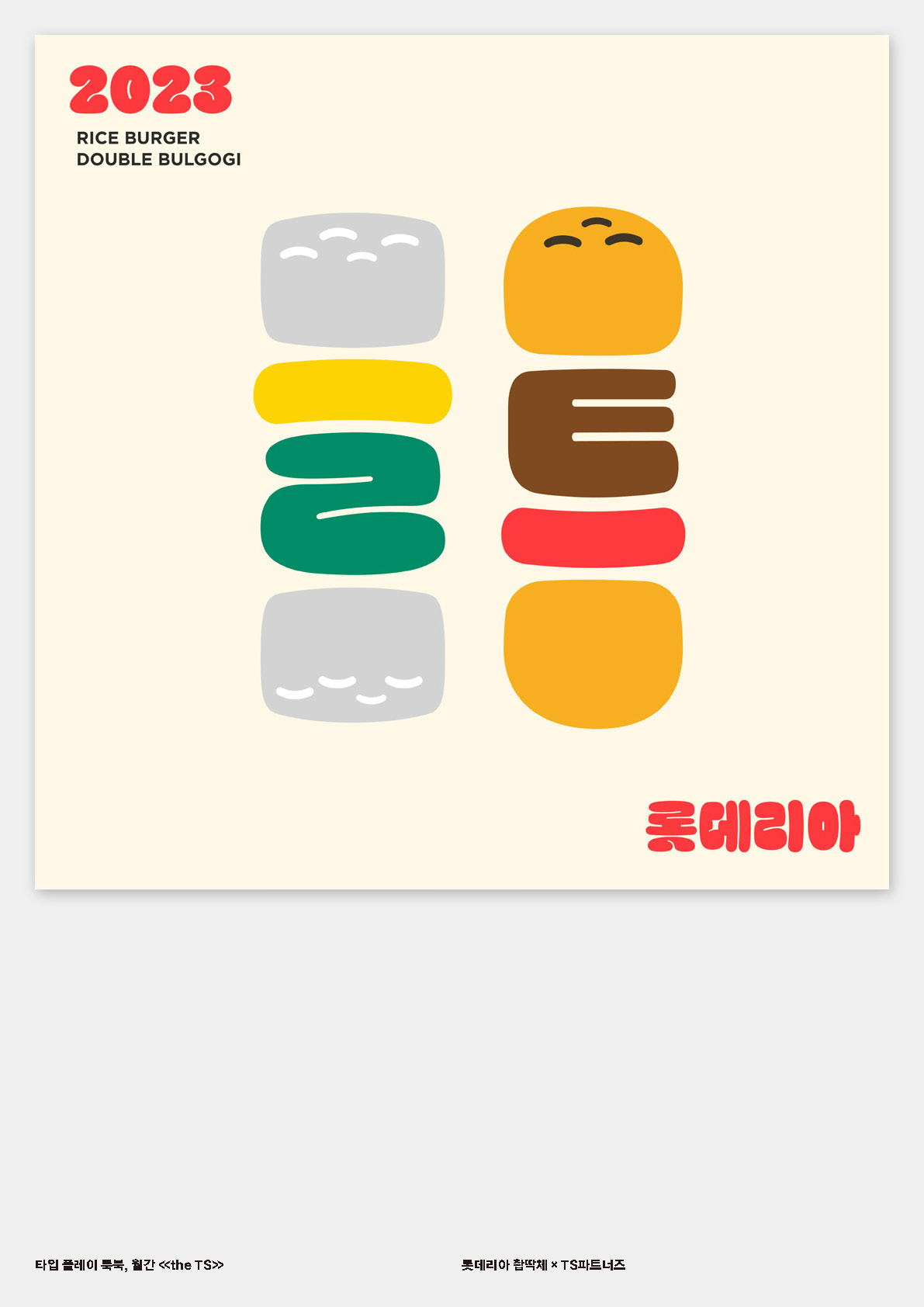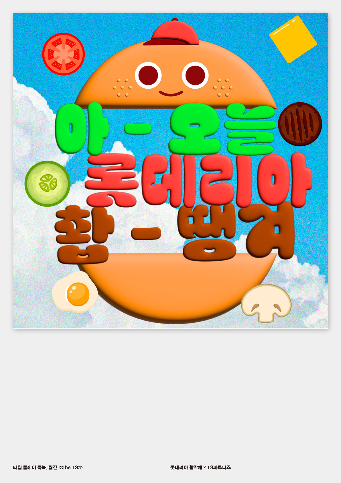 월간 《the TS》 2023년 3월호는 「촵딱체」 2종을 활용한 타이포그래피 작업물 모음입니다. 서체를 개발한 엉뚱상상, 그리고 TS 파트너즈(온라인 디자인 매체 『타이포그래피 서울』의 2030 크리에이터 그룹)가 디자인을 진행했습니다. TS 파트너즈 작업물의 경우, 2월 한 달간 일종의 공모전 형식으로 응모작들을 받아 그중 우수작 스무 편을 이번 월간 《the TS》에 수록했어요. 롯데리아 브랜드를 운영하는 롯데GRS 측에서 직접 우수작을 선정했습니다.