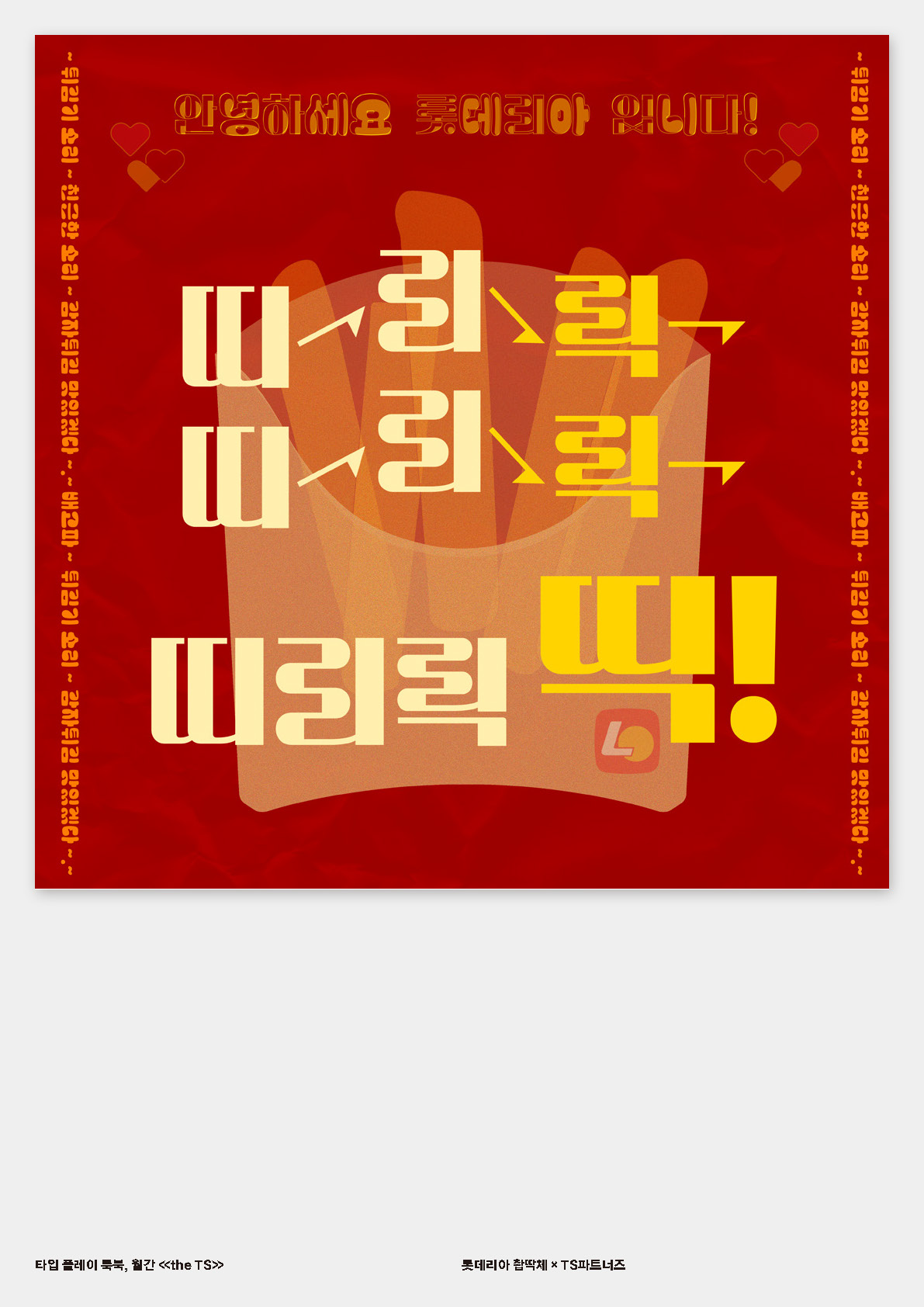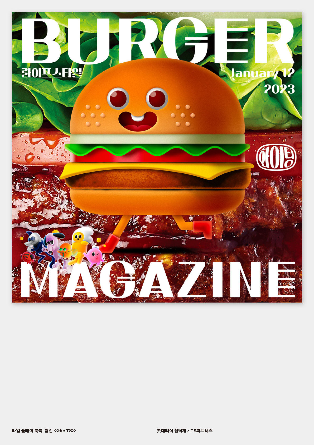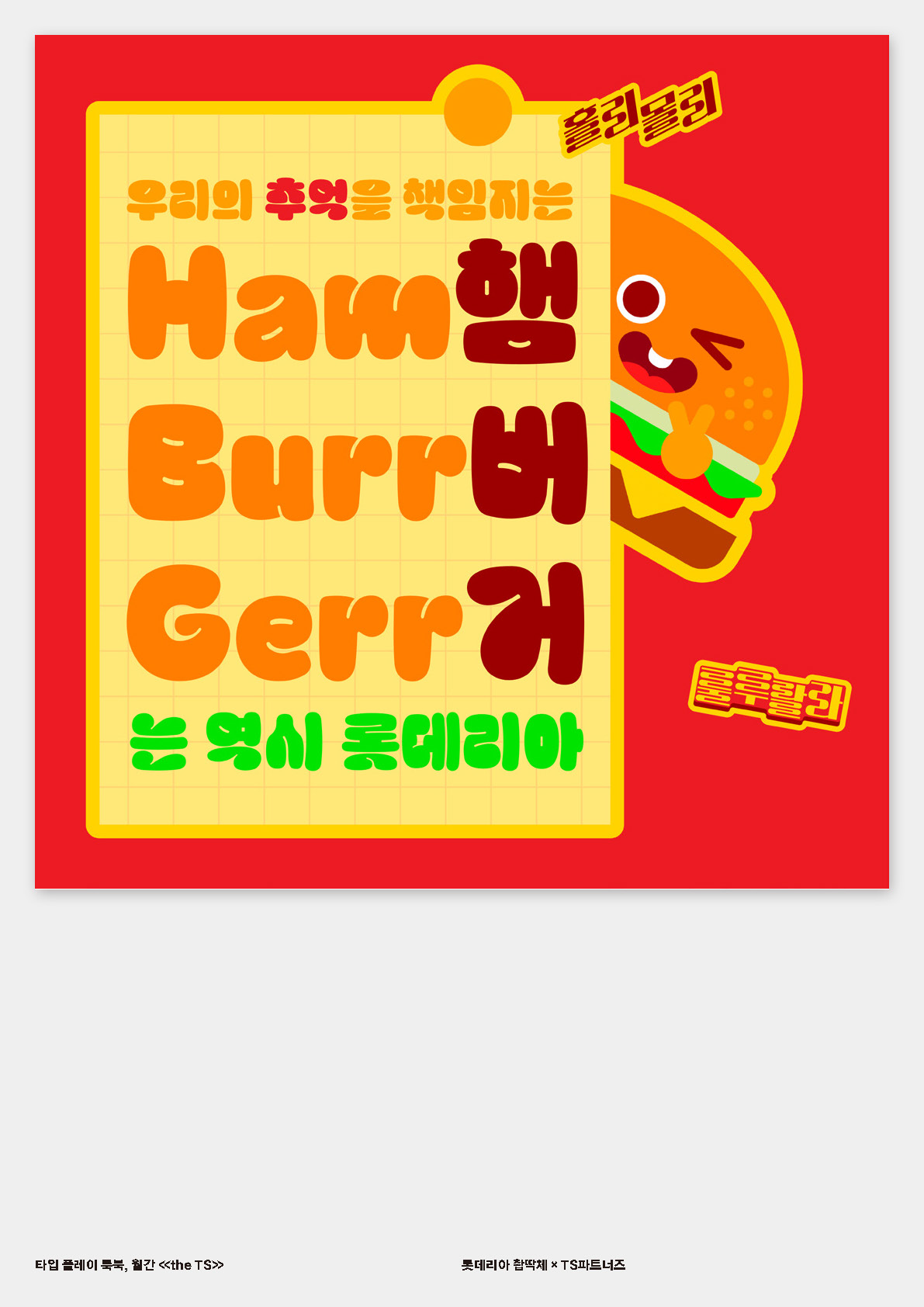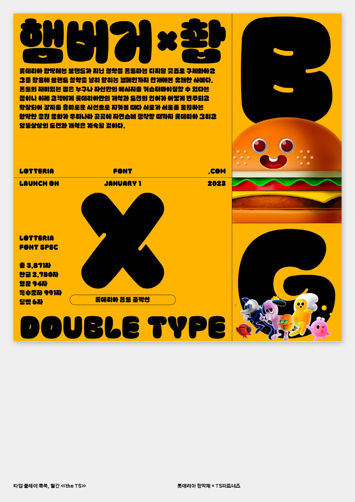 월간 《the TS》 2023년 3월호는 「촵딱체」 2종을 활용한 타이포그래피 작업물 모음입니다. 서체를 개발한 엉뚱상상, 그리고 TS 파트너즈(온라인 디자인 매체 『타이포그래피 서울』의 2030 크리에이터 그룹)가 디자인을 진행했습니다. TS 파트너즈 작업물의 경우, 2월 한 달간 일종의 공모전 형식으로 응모작들을 받아 그중 우수작 스무 편을 이번 월간 《the TS》에 수록했어요. 롯데리아 브랜드를 운영하는 롯데GRS 측에서 직접 우수작을 선정했습니다.