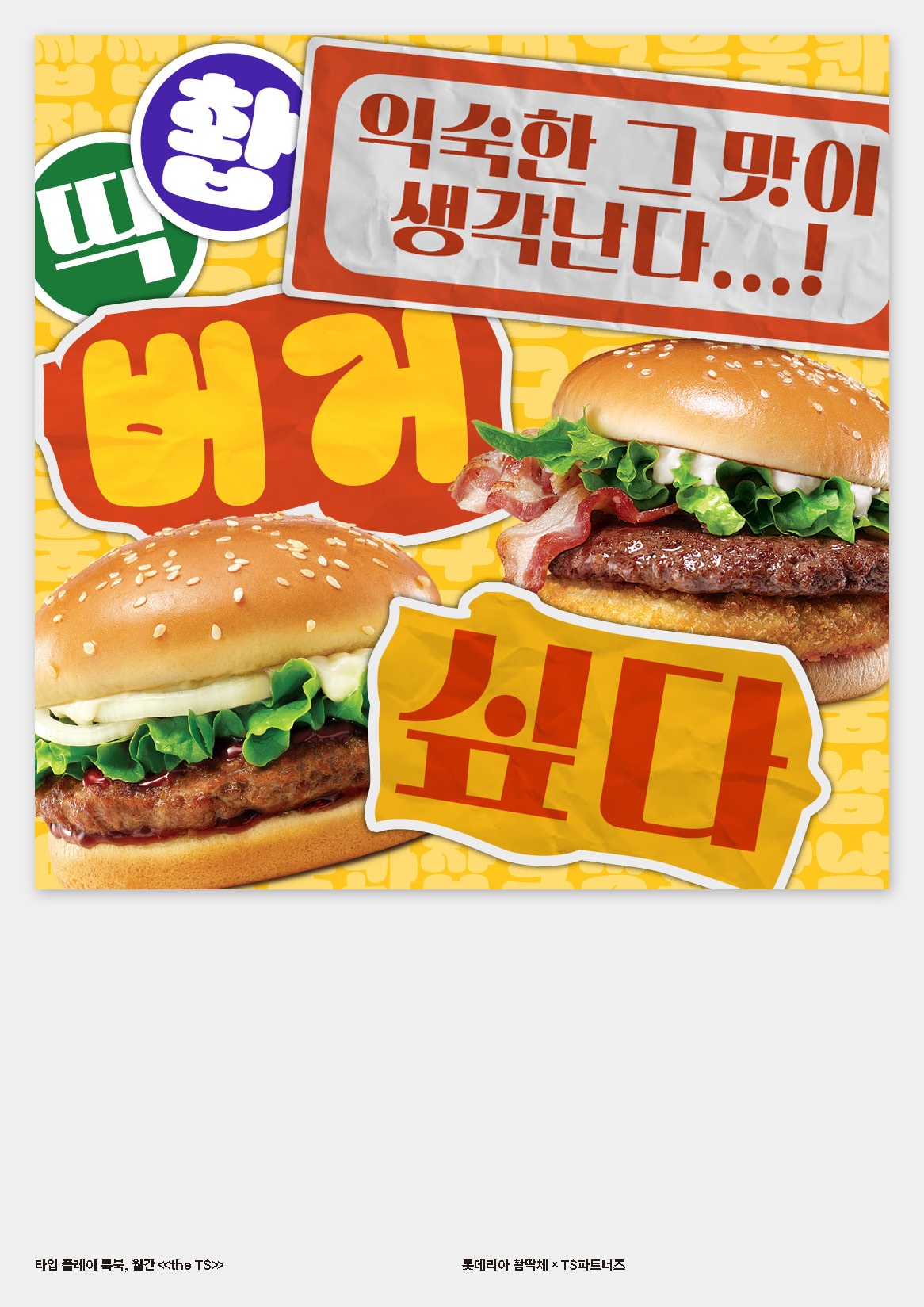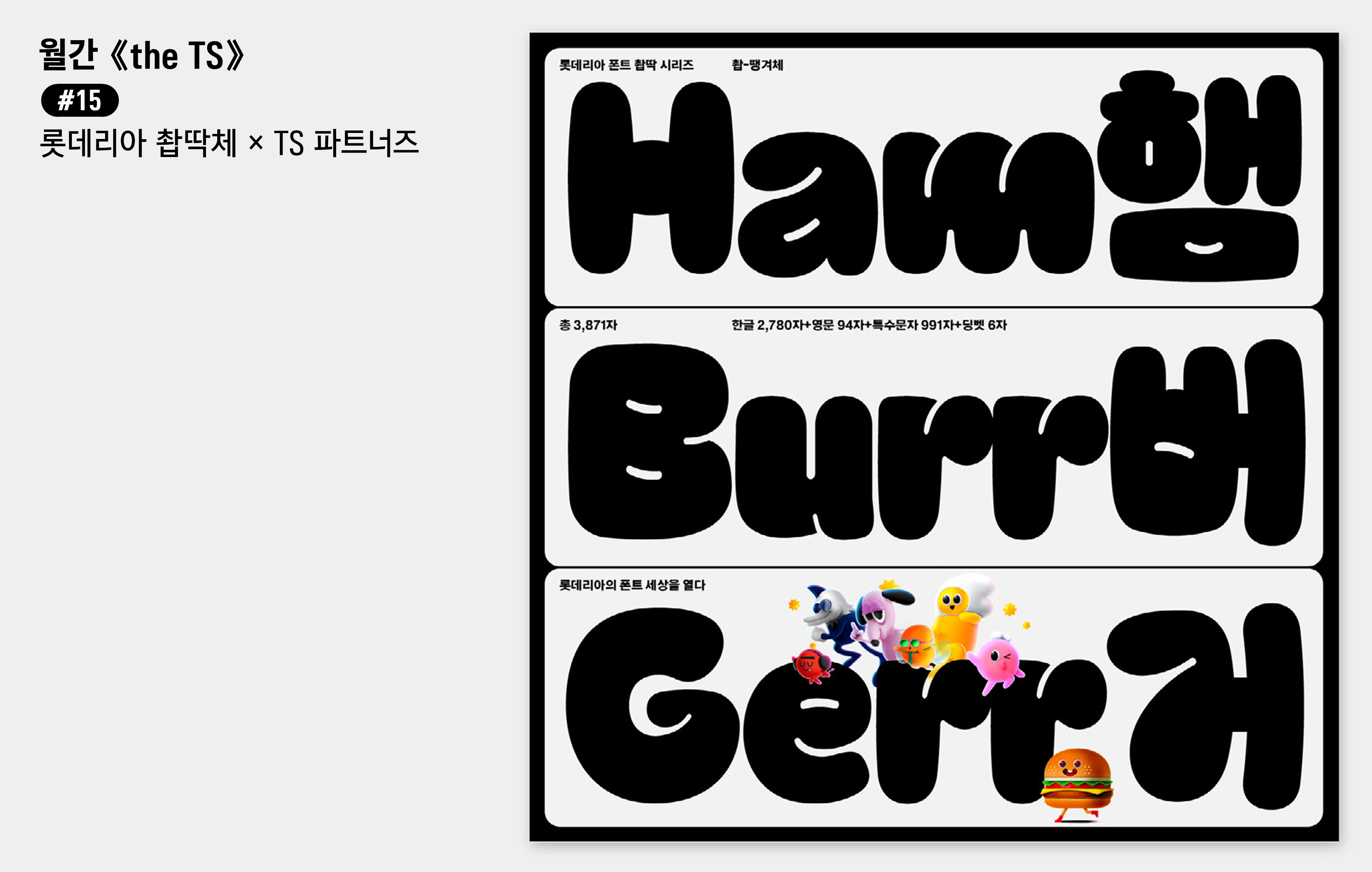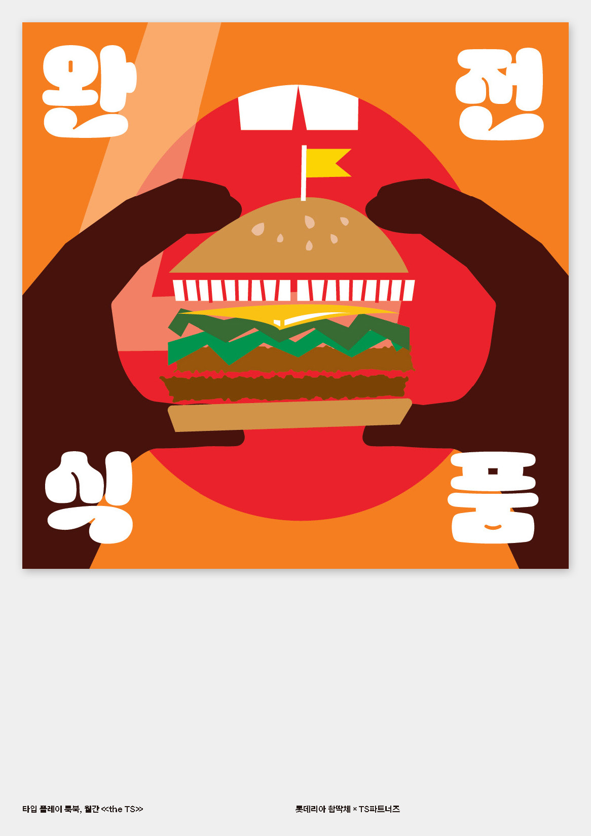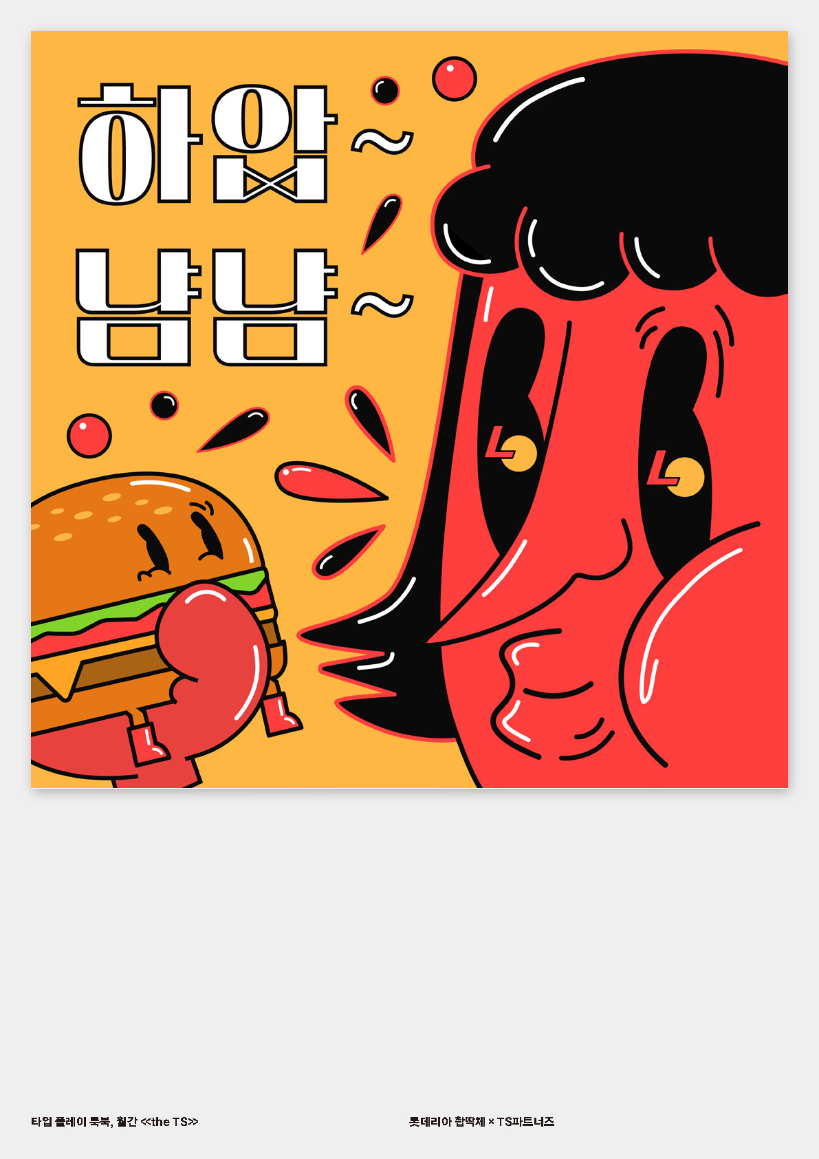 월간 《the TS》 2023년 3월호는 「촵딱체」 2종을 활용한 타이포그래피 작업물 모음입니다. 서체를 개발한 엉뚱상상, 그리고 TS 파트너즈(온라인 디자인 매체 『타이포그래피 서울』의 2030 크리에이터 그룹)가 디자인을 진행했습니다. TS 파트너즈 작업물의 경우, 2월 한 달간 일종의 공모전 형식으로 응모작들을 받아 그중 우수작 스무 편을 이번 월간 《the TS》에 수록했어요. 롯데리아 브랜드를 운영하는 롯데GRS 측에서 직접 우수작을 선정했습니다.