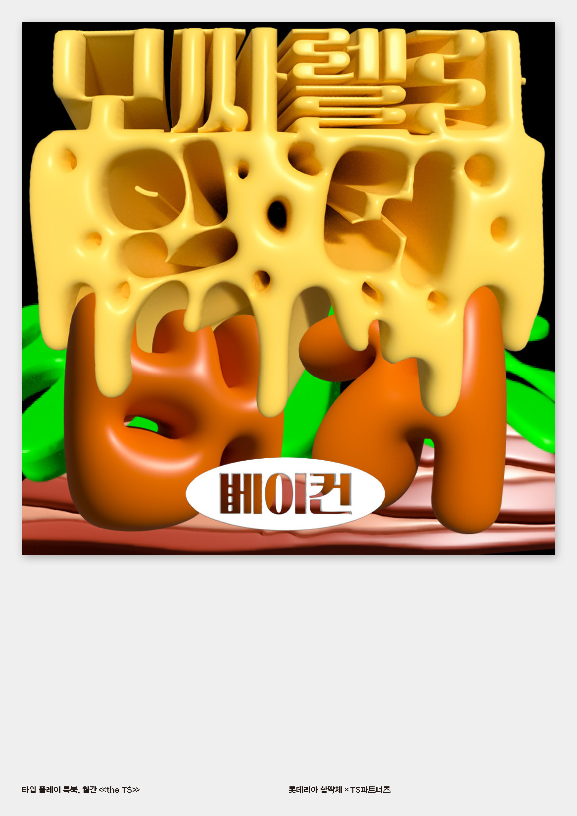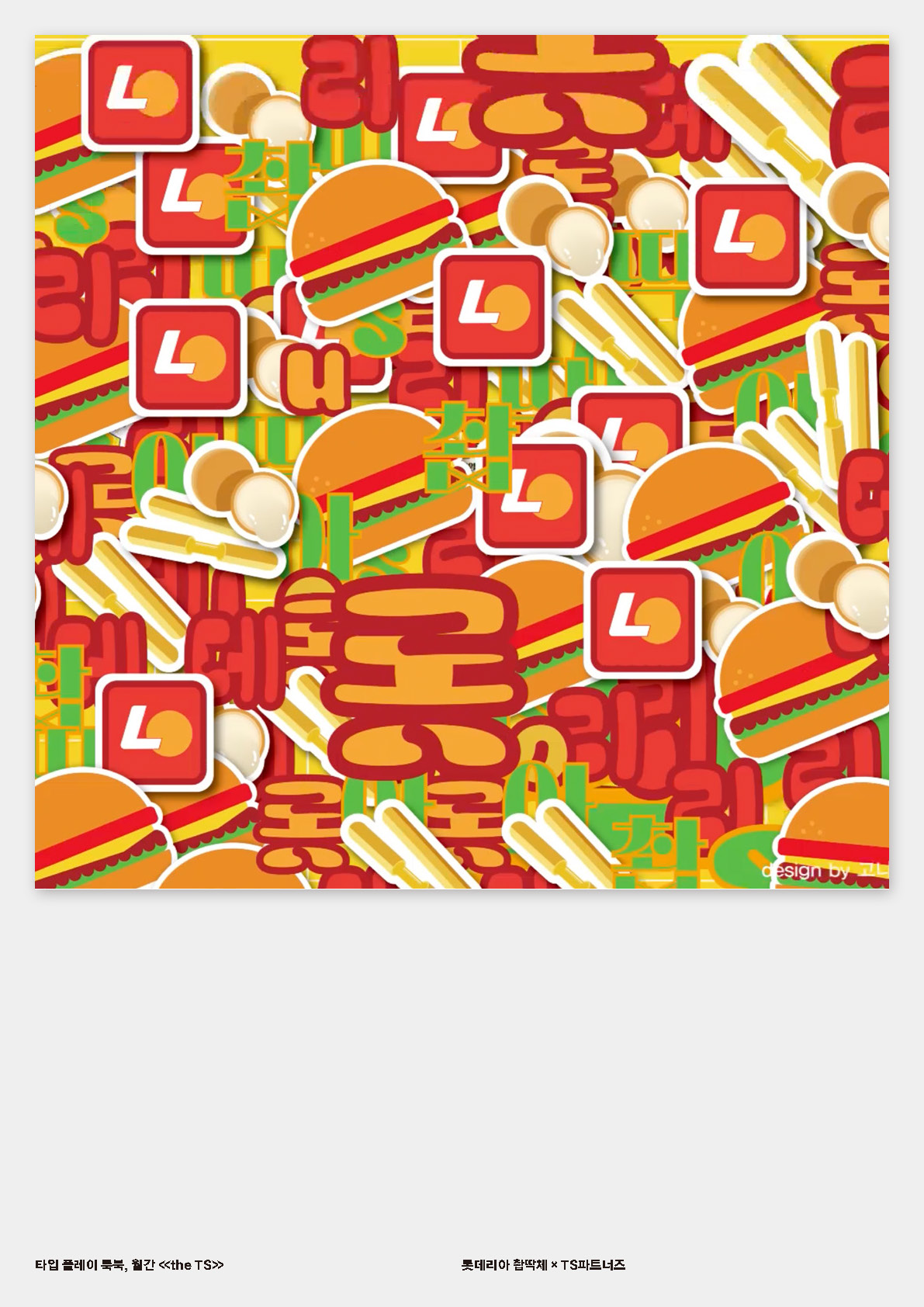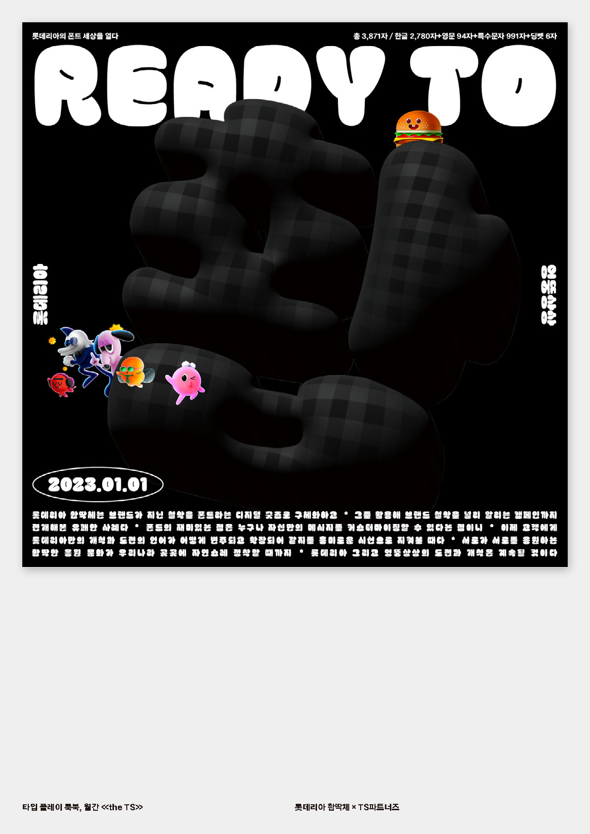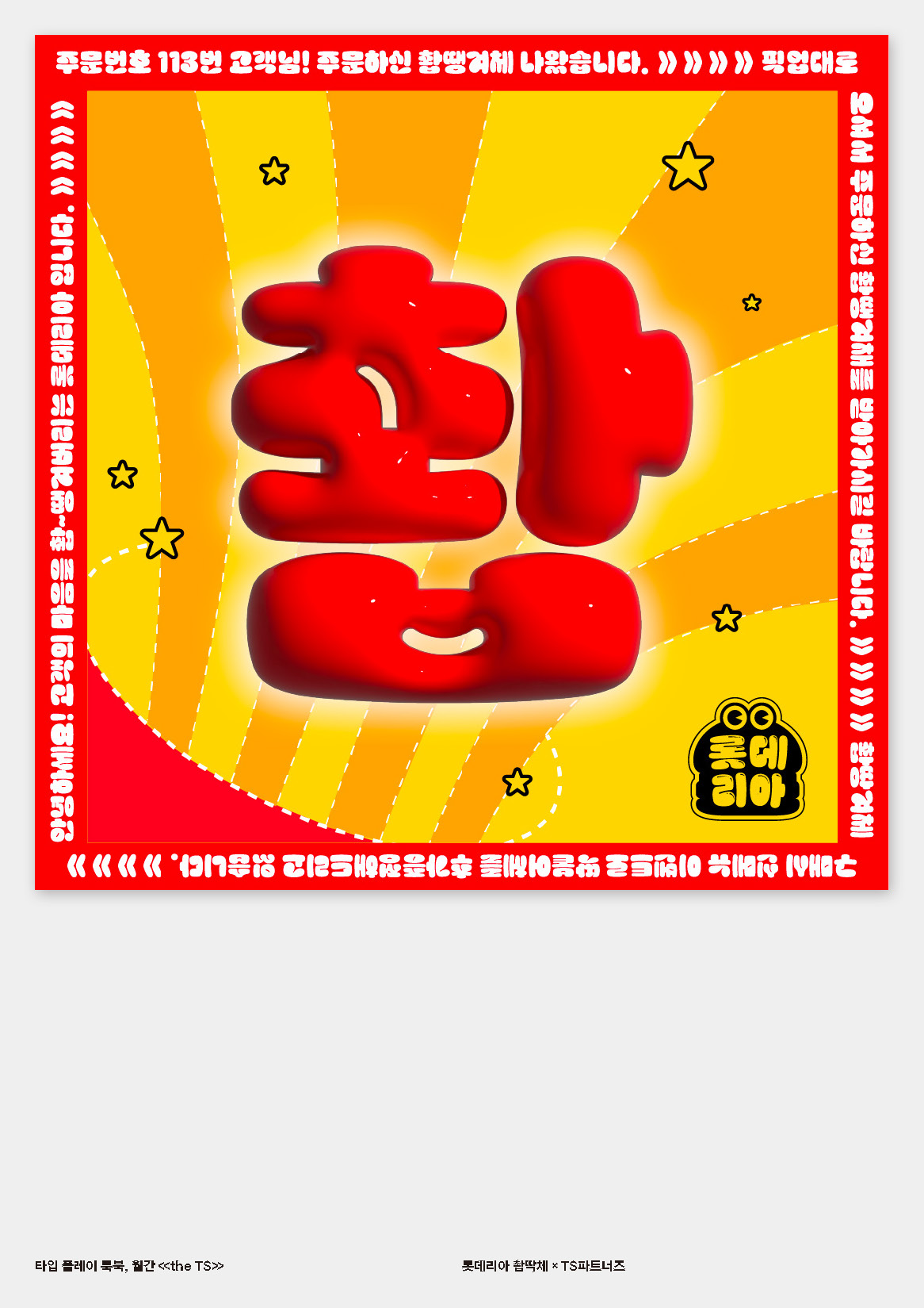 월간 《the TS》 2023년 3월호는 「촵딱체」 2종을 활용한 타이포그래피 작업물 모음입니다. 서체를 개발한 엉뚱상상, 그리고 TS 파트너즈(온라인 디자인 매체 『타이포그래피 서울』의 2030 크리에이터 그룹)가 디자인을 진행했습니다. TS 파트너즈 작업물의 경우, 2월 한 달간 일종의 공모전 형식으로 응모작들을 받아 그중 우수작 스무 편을 이번 월간 《the TS》에 수록했어요. 롯데리아 브랜드를 운영하는 롯데GRS 측에서 직접 우수작을 선정했습니다.