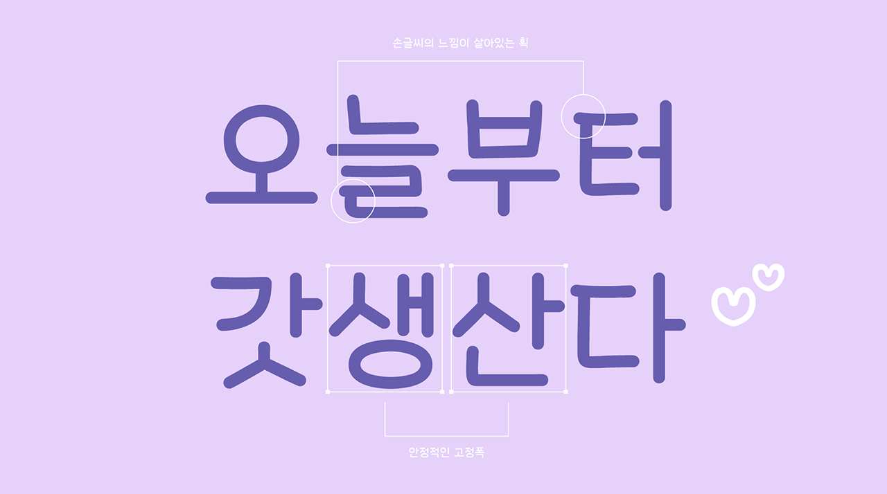 갓생살기는 네모 틀 안에 쓰였지만 완벽하게 똑바르지 않고, 둥글게 처리된 라운드 형태와 초성보다 큰 종성이 손글씨의 귀여운 매력을 한껏 높여줍니다.