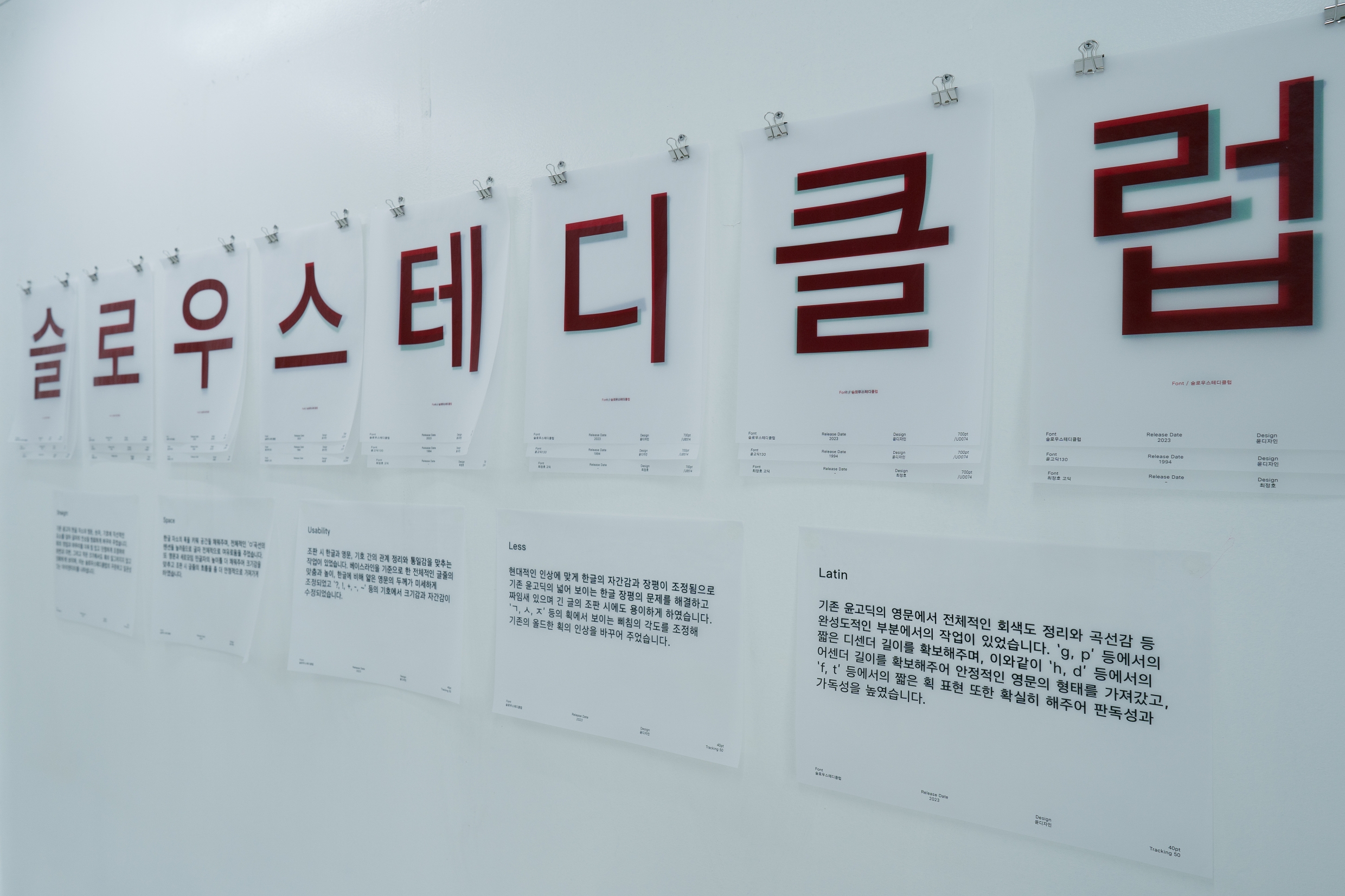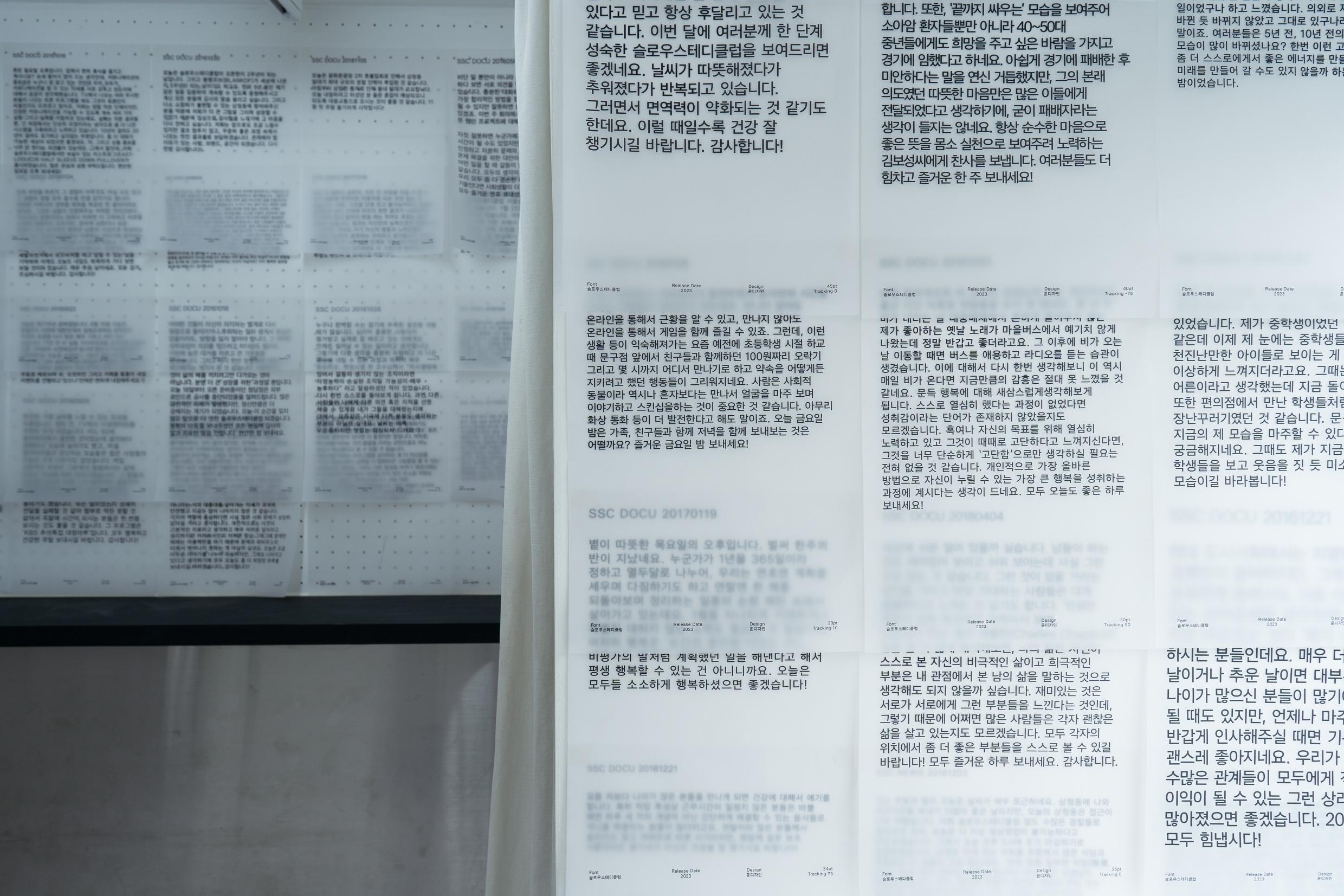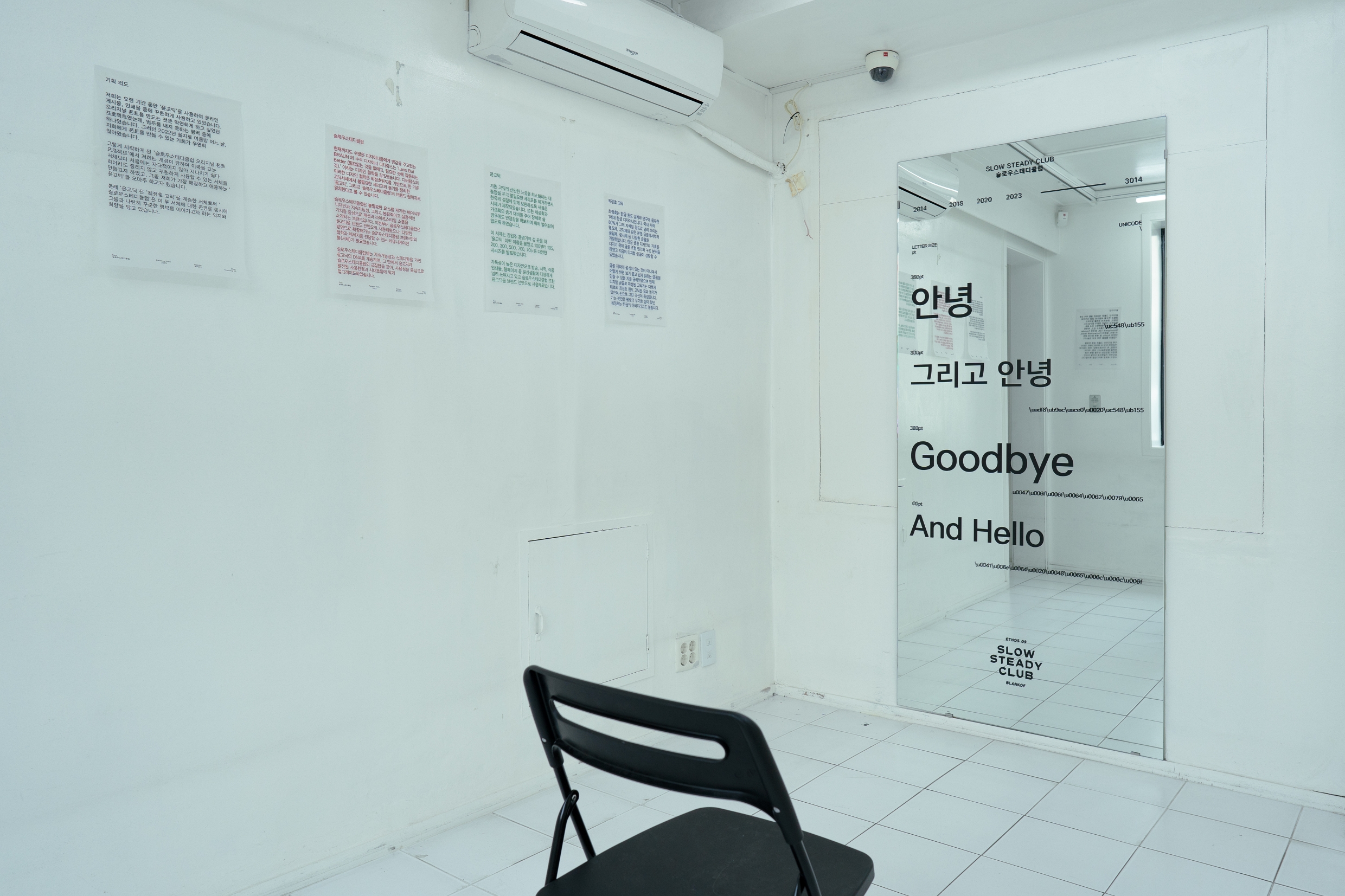 고별전 〈안녕〉은 「SSC 서체」로 구성되었는데요. 전시장을 메운 이야기 페이지들, 벽면의 안내문들은 모두 「SSC 서체」로 인쇄된 결과물들입니다. 공간 1층에는 「SSC 서체」를 소개하는 방이 따로 마련되어 있었어요. 슬로우스테디클럽이 윤디자인그룹과 함께 브랜드 서체(오리지널 폰트)를 만들게 된 배경, 서체의 주요 특징과 사양 등을 소개한 특별관이었습니다.