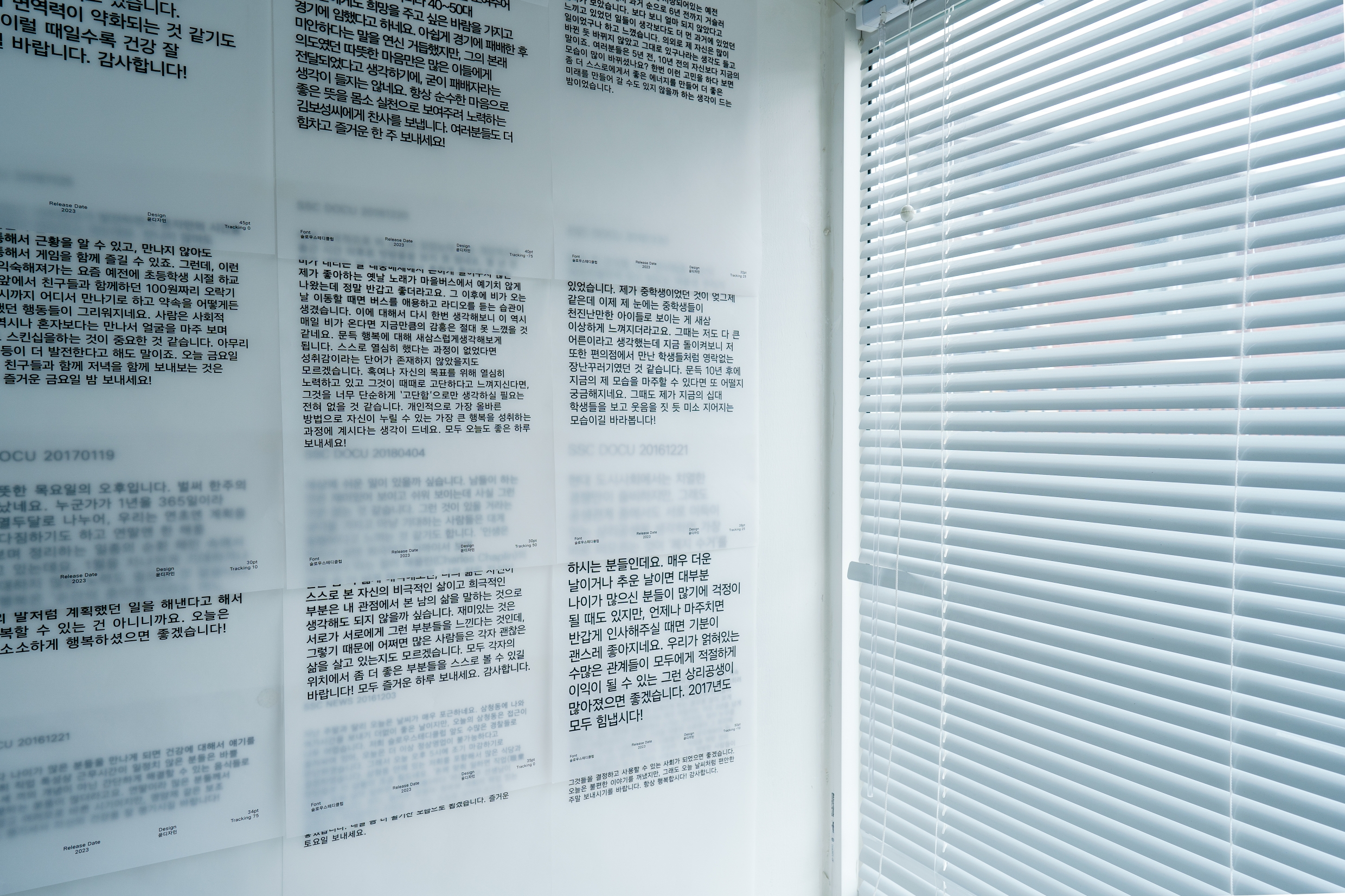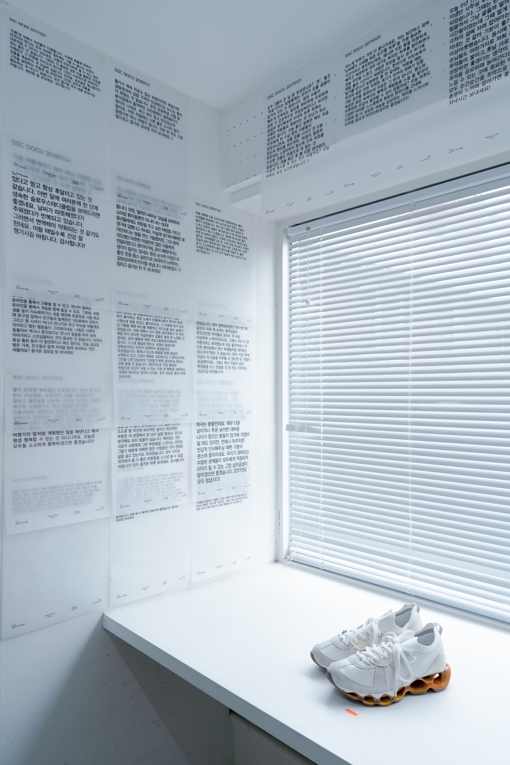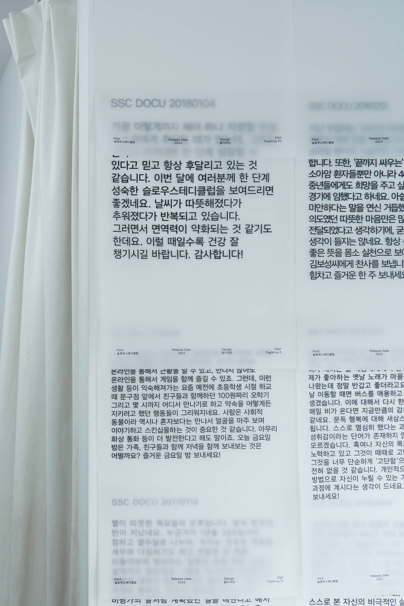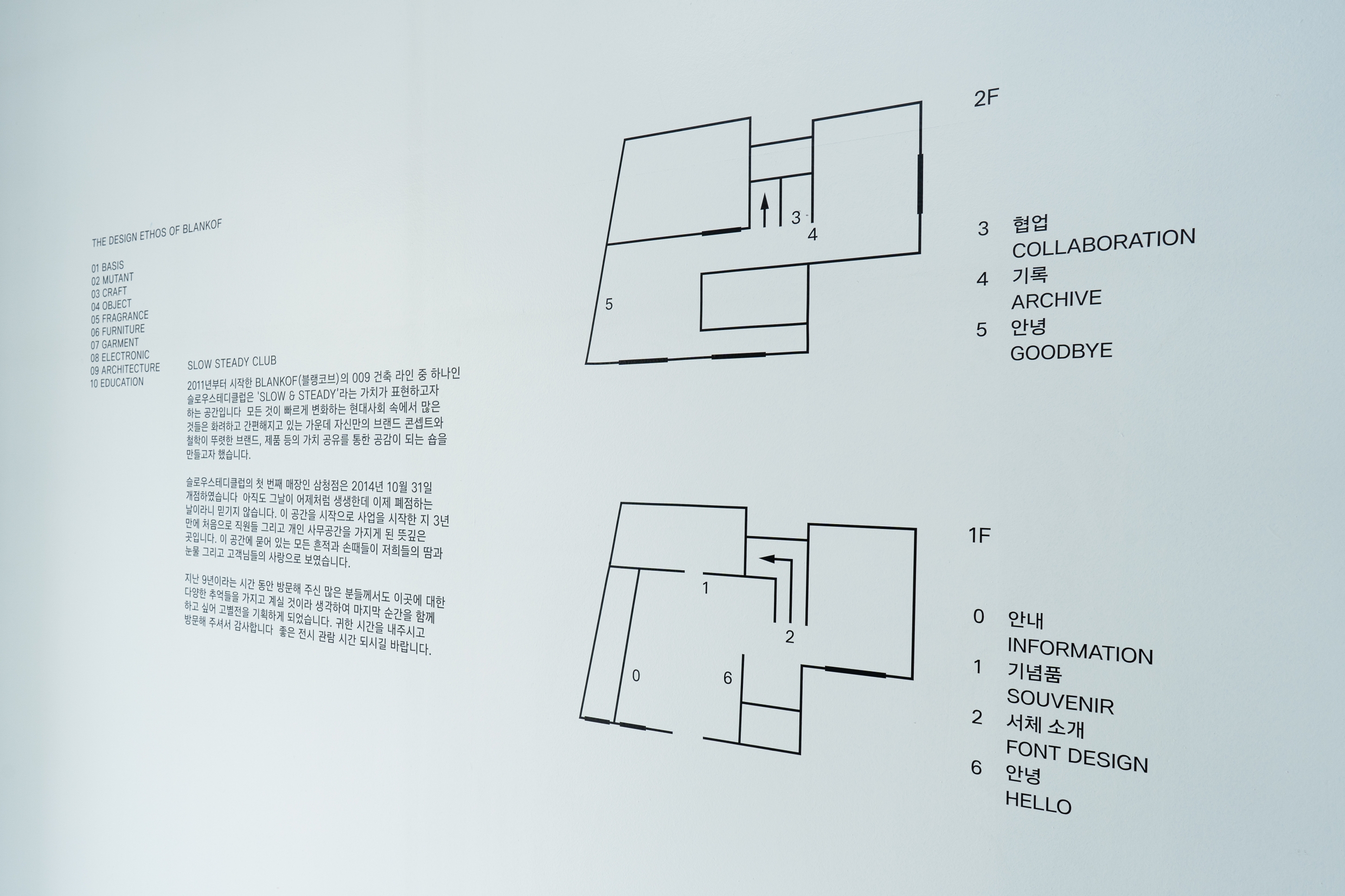 고별전 〈안녕〉은 「SSC 서체」로 구성되었는데요. 전시장을 메운 이야기 페이지들, 벽면의 안내문들은 모두 「SSC 서체」로 인쇄된 결과물들입니다. 공간 1층에는 「SSC 서체」를 소개하는 방이 따로 마련되어 있었어요. 슬로우스테디클럽이 윤디자인그룹과 함께 브랜드 서체(오리지널 폰트)를 만들게 된 배경, 서체의 주요 특징과 사양 등을 소개한 특별관이었습니다.