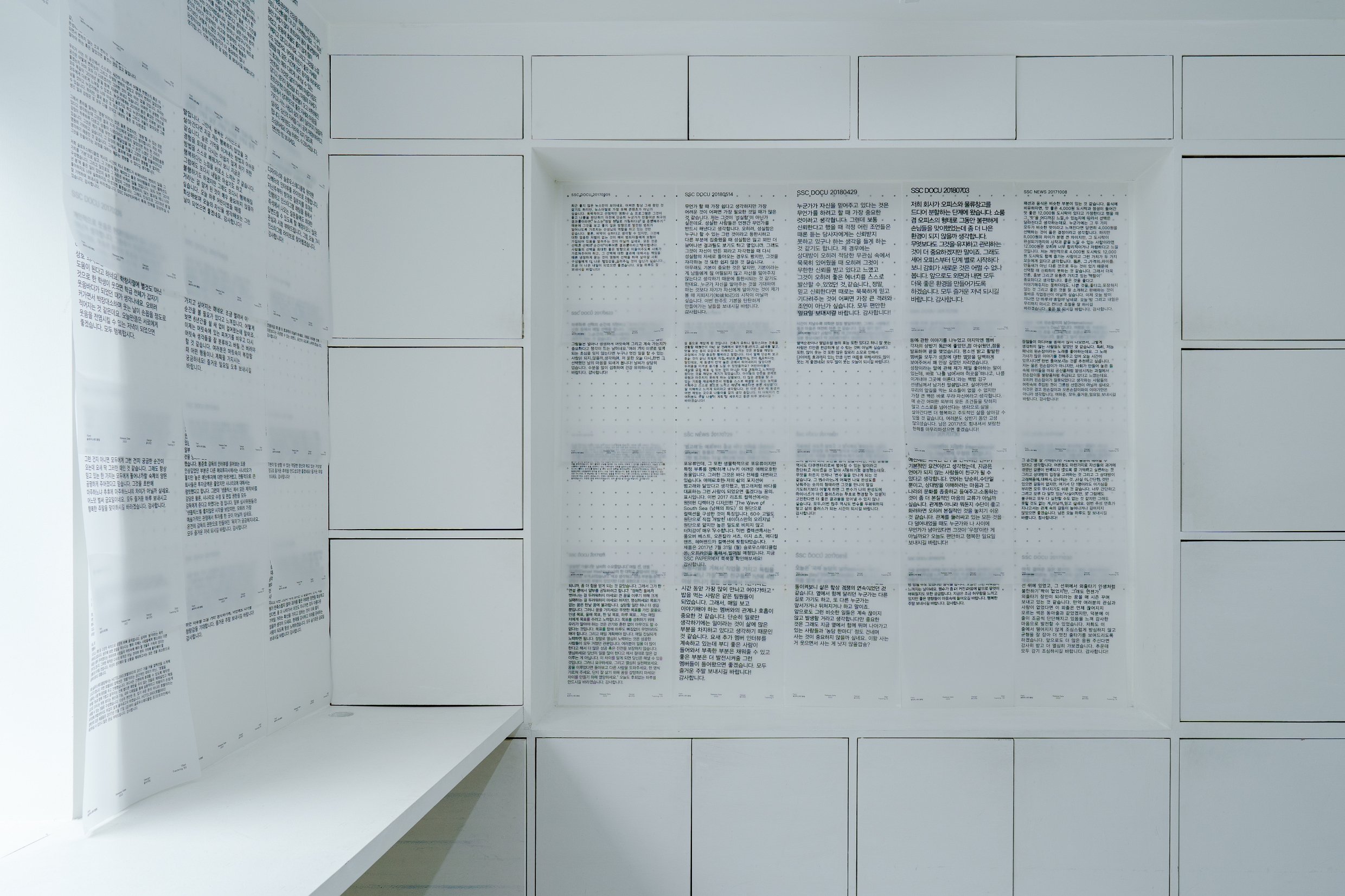 〈안녕〉은 이야기들로 채운 전시였습니다. 비유적 표현이 아니라, 수많은 이야기들의 인쇄된 페이지들이 벽면 가득 펼쳐져 있었어요. 삼청점을 운영했던 이들이 직접 기록한 추억들이었습니다. 매장을 처음 열던 날의 이야기, 삼청동 골목의 맛집 이야기, 손님들과의 추억, 이 공간 안에서 느꼈던 온갖 일상다반사들, ⋯⋯. 이야기들을 읽어 가며 천천히 1층과 2층을 거닐다 보니, 마치 이 공간과 대화를 나누는 기분이 들었습니다.