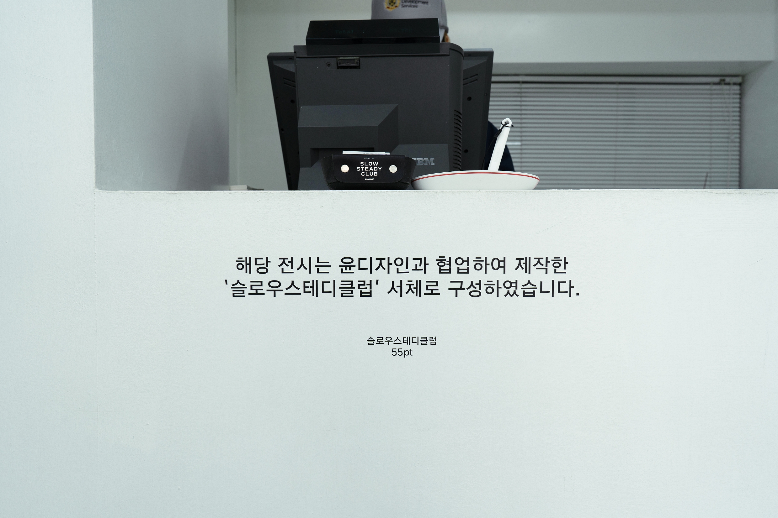 슬로우스테디클럽 삼청점의 9년치 이야기들을 기록한 글자, 고별전 기간 동안 이 공간의 목소리가 되어준 글자. 바로 「슬로우스테디클럽 서체」(이하 SSC 서체)입니다. 윤디자인그룹과 슬로우스테디클럽이 협업하여 개발한 서체로, 올 2월 폰트 마켓 폰코(FONCO)를 통해 처음 공개되었습니다.