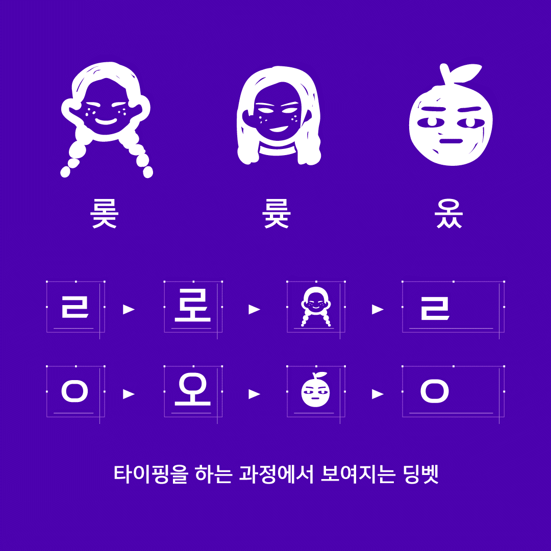 주희 로지는 반려과일인 오렌지 ‘오씨’가 있는데 오씨를 쓰는 중간에 ‘옸’이라고 쓰게 되잖아. 그때 오씨의 모습을 딩벳으로 담았어. 마찬가지로 로지의 ‘롲’, 류지의 ‘륮’에서도 딩벳을 볼 수 있지. 이 글자들은 일상생활에서는 거의 쓰지 않기 때문에 한글 대신 글립을 대체해서 디자인했고, 추가적으로 사용자 영역에도 포함했어.