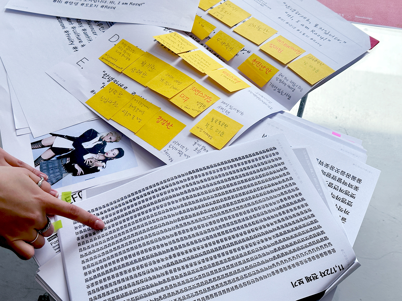 주희 첫 번째는 아까 말했던 것처럼 어느 성별에도 치우치지 않는 느낌이 있어야 한다는 게 콘셉트였어. 그리고 로지는 손으로 글씨를 쓰는 게 익숙하지 않다는 설정이라서 정갈한 글씨체보다는 조금 흘려 쓴 느낌이고, 획순이 조금 이상하더라도 그냥 허용하는 것으로 했지. 그래서 내가 원도를 직접 쓸 때도 일부러 펜을 길게 잡고 썼어. 예를 들어 따옴표의 형태가 뒤집혀서 어리숙한 느낌으로 접근했지. 로지의 외형적인 모습은 고딕체에 많이 담고, 손글씨에는 로지의 성격을 담았어.