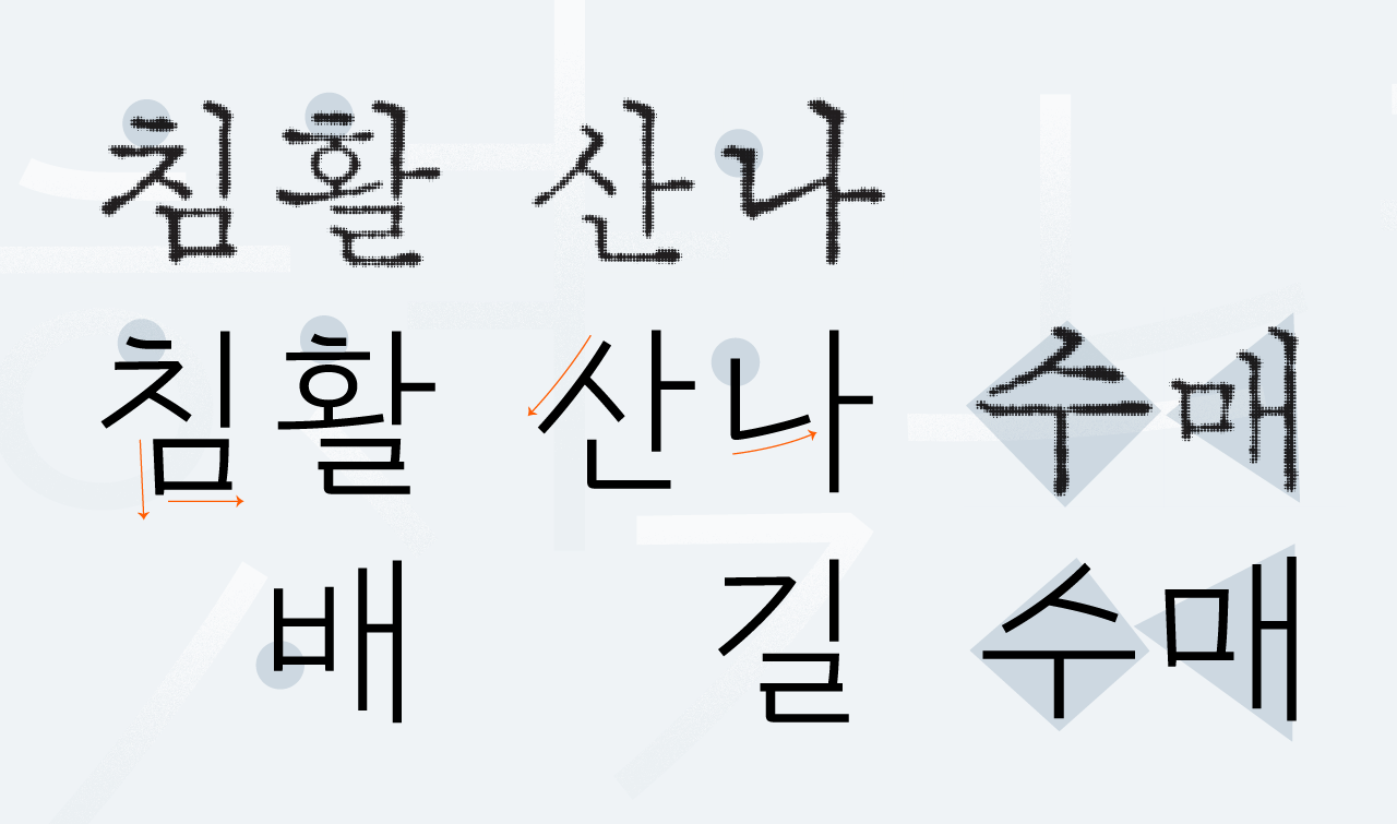 붓으로 글자를 써 내려가는 서예로부터 시작된 명조체는 글자를 쓰는 움직임은 물론 쓰는 이의 마음도 담겨 있습니다. 목선담이 찾은 움직이는 고딕체란, 필획이 느껴지는 글자이자, 글자에 담긴 마음으로 또 다른 누군가의 마음을 움직이는 글자입니다.