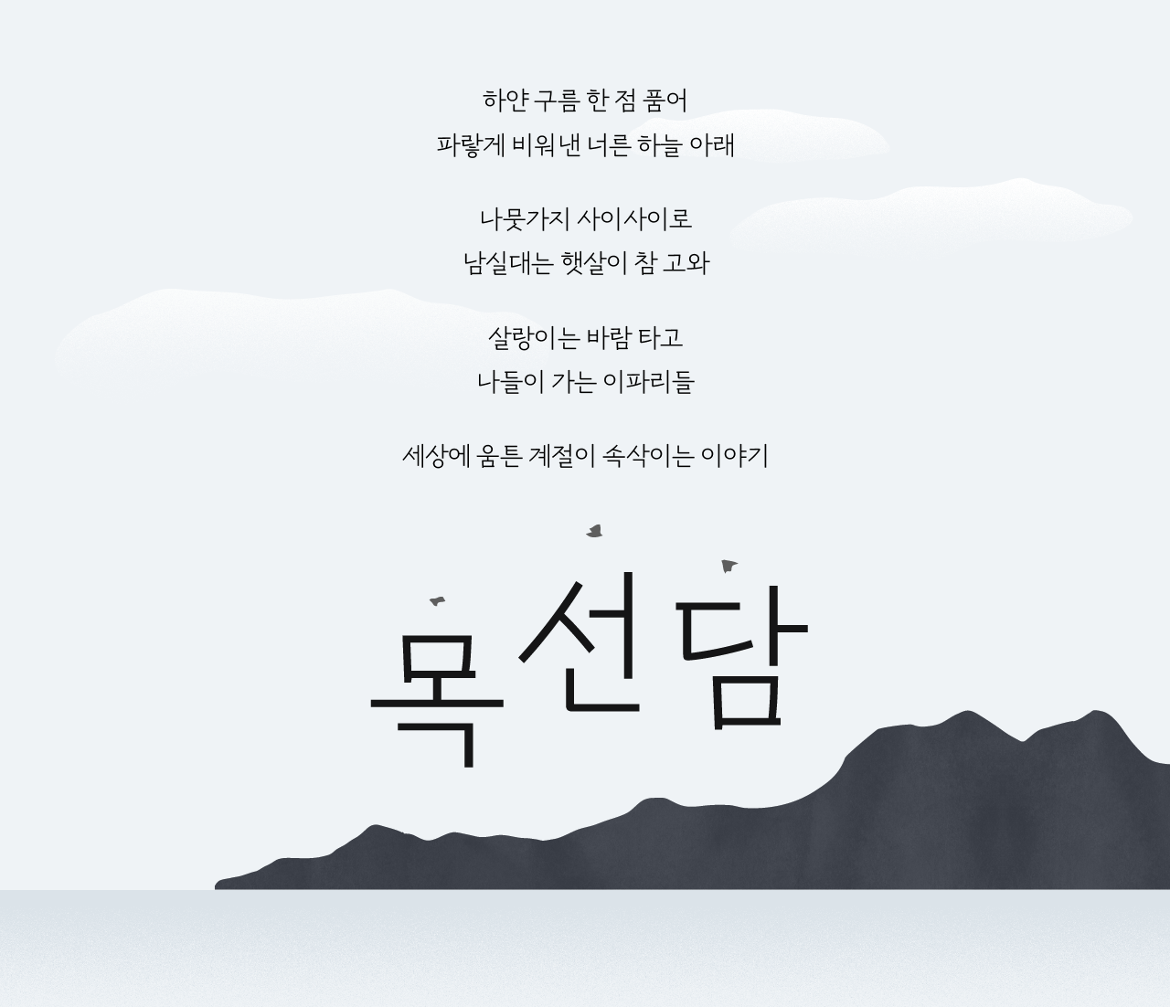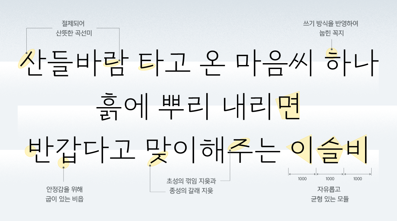 여유롭고 서정적인 느낌이 은은하게 풍겨오는 목선담은 필획이 느껴지는 자소, 절제되어 산뜻한 곡선, 자유롭고 균형 있는 모듈이 특징으로, 공간이 살아있는 고딕체입니다. 세상에 움틀다 못해 만개한 봄, 여러분을 만난 목선담이 저마다의 시각과 다양한 쓰임으로 다시 또 해석되기를 바랍니다.