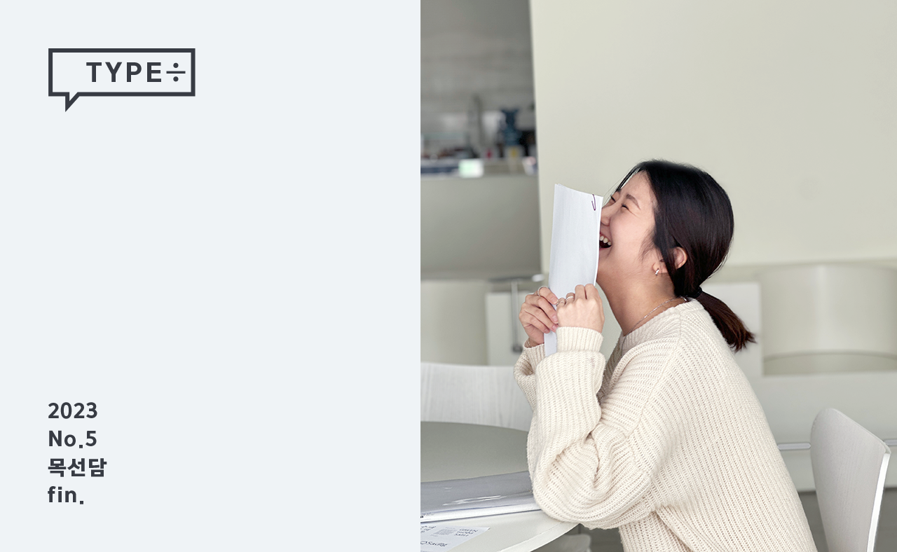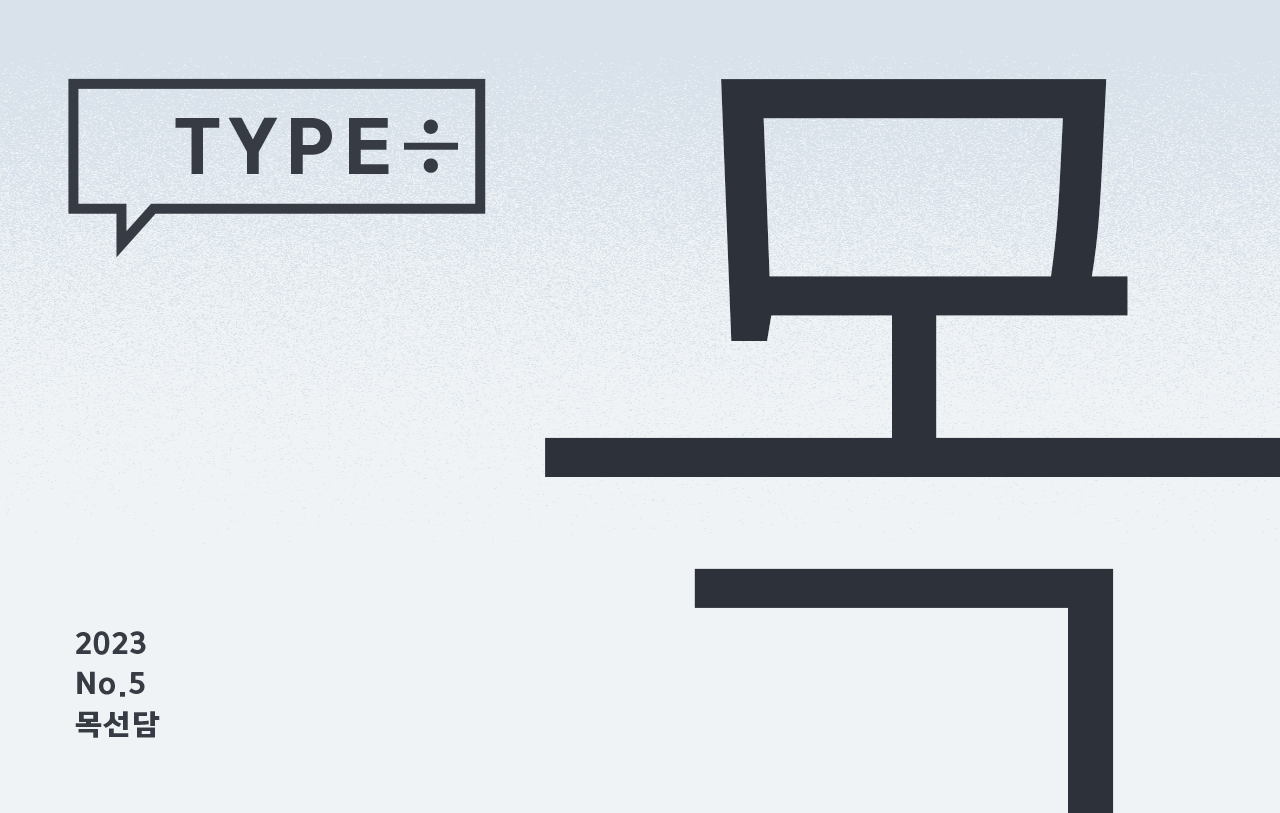 2023년 연재 콘텐츠 [TYPE÷](타입나누기)는 윤디자인그룹 TDC(Type Design Center)가 제작하여 새로 출시한 서체, 즉 타입(type)에 관해 나눈 타입 디자이너들의 스몰토크입니다. 서체를 만든 담당 디자이너의 영감과 제작 의도, 비하인드 스토리, 그리고 동료 디자이너들의 관점은 또 어떨지. 하나의 서체를 주제로 그 서체와 어울리는 공간에서 타입 디자이너들이 대화를 나누고 이를 기록하여 들려드립니다.