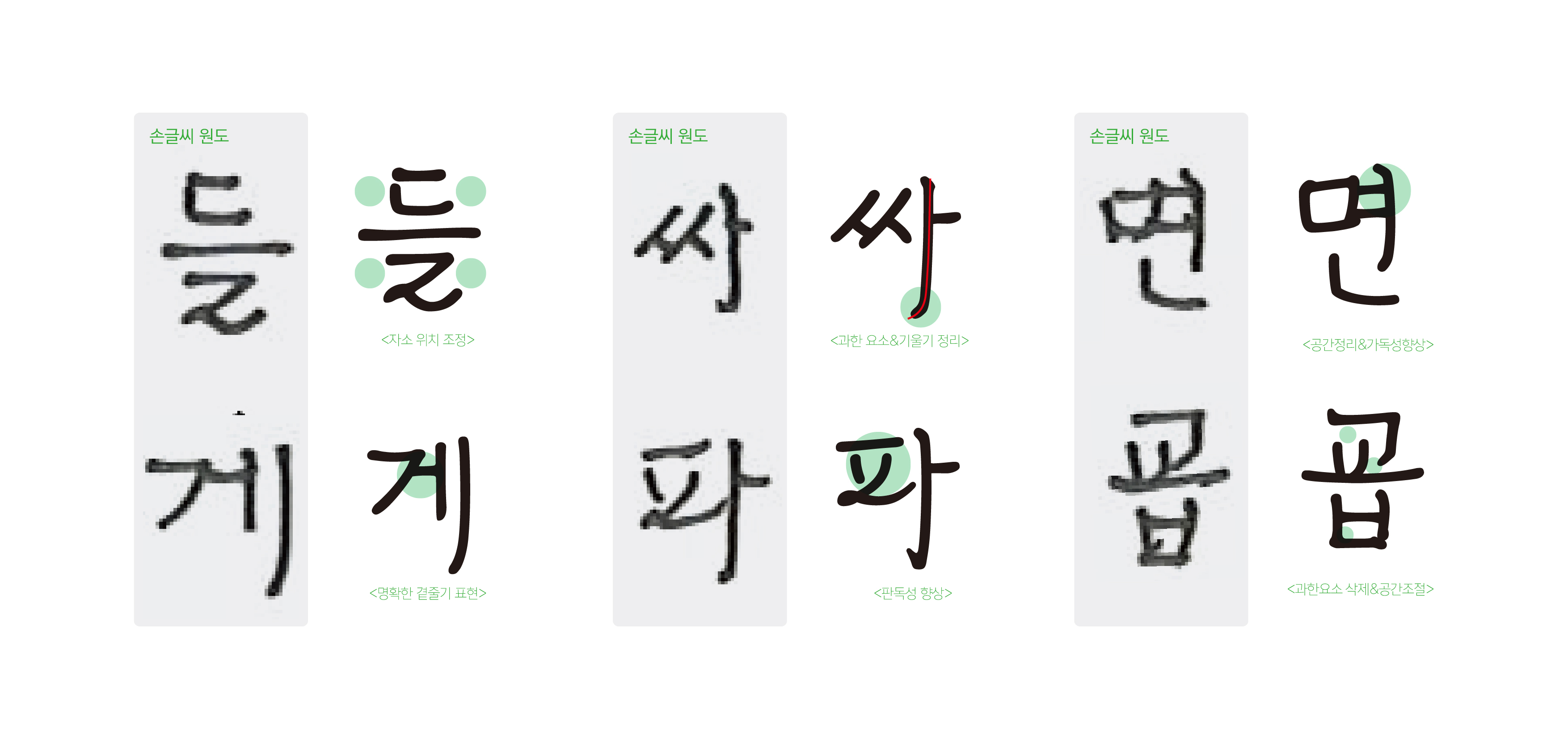 손글씨 폰트 제작에서 또 하나 중요한 것은 사용성을 고려해 정리하는 과정입니다. 원도의 개성과 특징을 유지하면서도 글자 간의 고른 균형을 위해 공간감, 크기감, 조형성 등을 조정합니다. 나아가 오독의 여지가 있는 글자들은 판독성이 분명하도록 수정을 진행합니다. 「교보 손글씨 2022 김혜남」 서체는 펜으로 썼을 때의 잉크 뭉침과 과하게 표현된 요소를 완화하는 것을 중점적으로 진행했습니다.