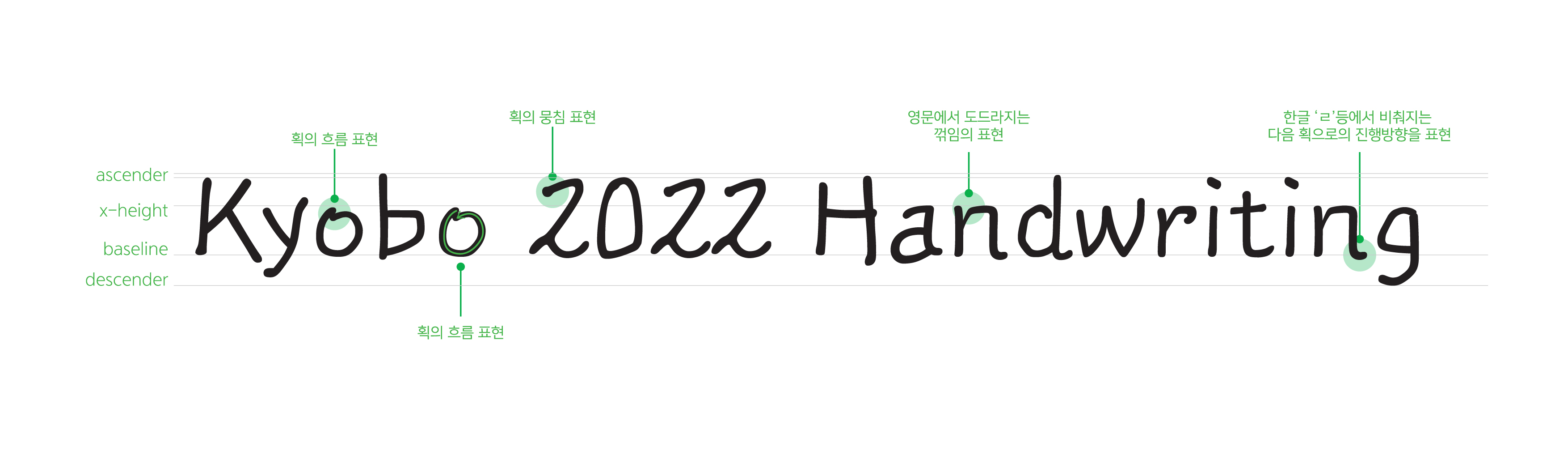 「교보 손글씨 2022 김혜남」 서체는 상단에 가지런하게 정리된 글줄을 갖고 있어 단정하고 서정적인 분위기를 줍니다. 글자폭은 모임꼴별로 다르게 설정해(가변폭 서체) 개성과 운율감이 도드라지도록 제작했습니다. 나아가 폰트로써의 활용도를 높이기 위해 가독성과 판독성을 개선했습니다.