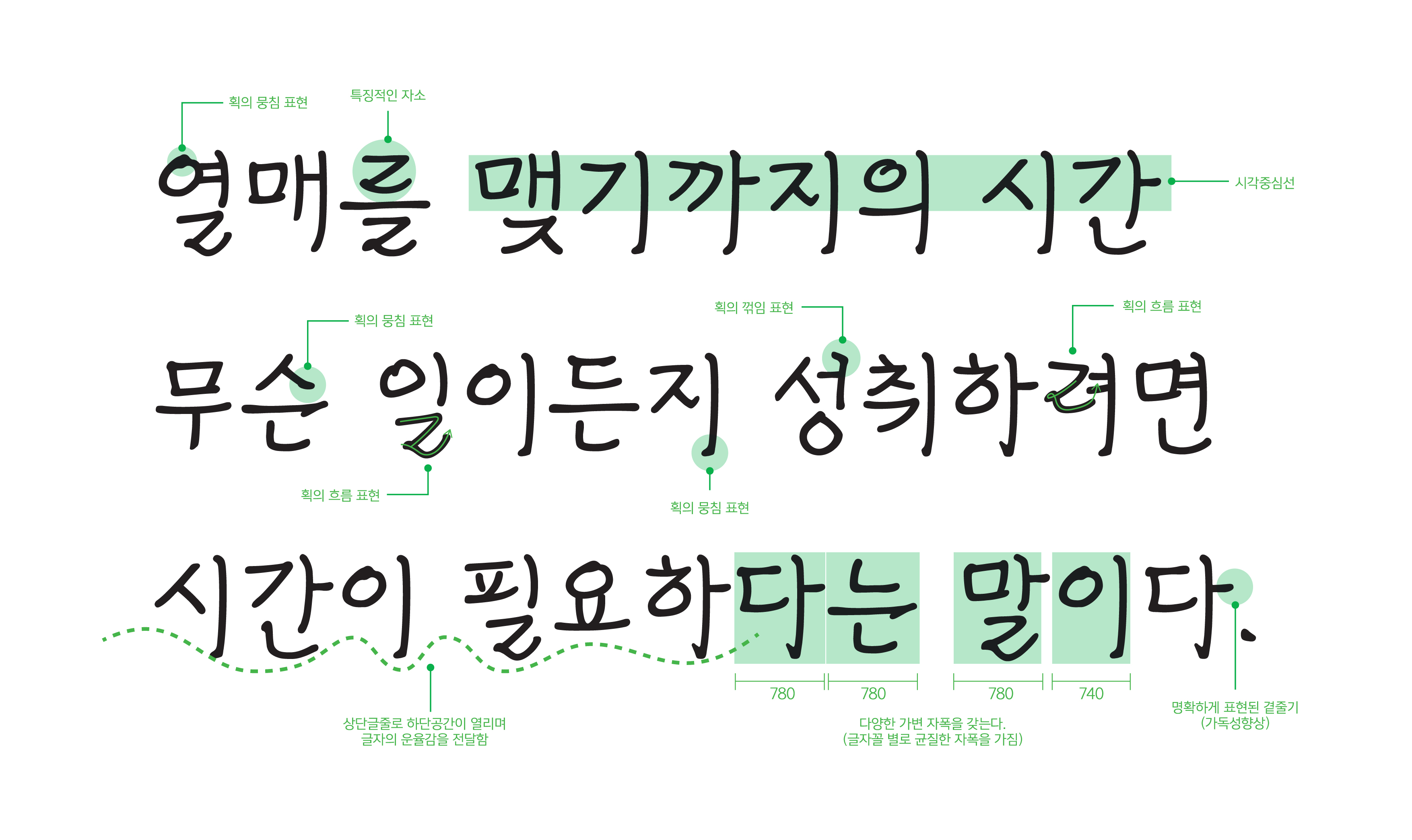 획의 시작과 끝, 연결점 등에서 나타나는 잉크 뭉침(ㅇ꼴), 글씨의 진행 방향을 알 수 있는 흐름 표현(ㄹ꼴), 곡선과 직선이 공존하는 자소 표현(ㅍ, ㄷ꼴) 등 특유의 개성이 넘칩니다. 가로, 세로 획의 굵기차가 적고 세로로 긴 장체폭의 서체로 서정적인 글의 본문용에 활용도가 높습니다.