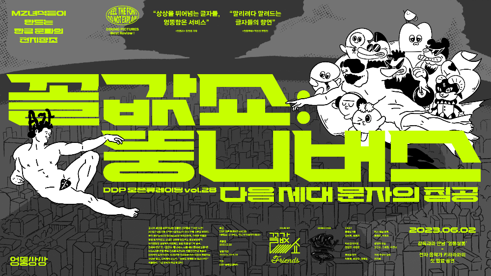 2023년 5월 20일부터 동대문디자인플라자(대표이사 이경돈, 이하 DDP) 둘레길갤러리에서 엉뚱상상의 여섯 번째 꼴값쇼 〈꼴값쇼: 뚱니버스, 다음 세대 문자의 침공〉 전시가 열립니다. 문자를 기반으로 한 엉뚱상상만의 재기발랄한 상상력이 이번에는 종합 예술 장르의 궁극, 영화와 만나 관람객들에게 색다른 영감을 선사할 예정이죠.