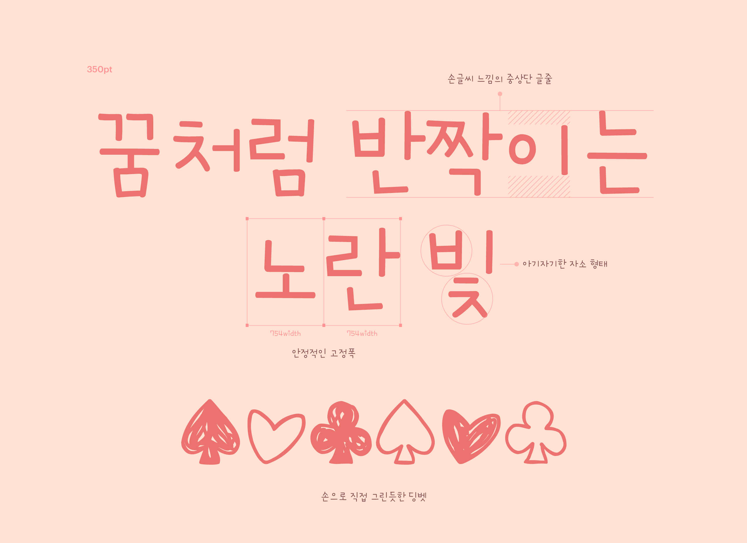 자연스러운 획과 오밀조밀한 자소의 인상이 굉장히 감성적으로 다가오는데요, 종성의 크기가 상대적으로 작아 귀여운 느낌도 듭니다. 글자의 여백이나 중상단으로 설정한 시각 중심선, 고정폭으로 인해 손글씨 폰트지만 읽기 편안합니다. 또한 영문에서는 소문자 ‘i’가 특징적이며, 손으로 그린 듯한 딩벳도 찾아보는 재미가 있습니다.