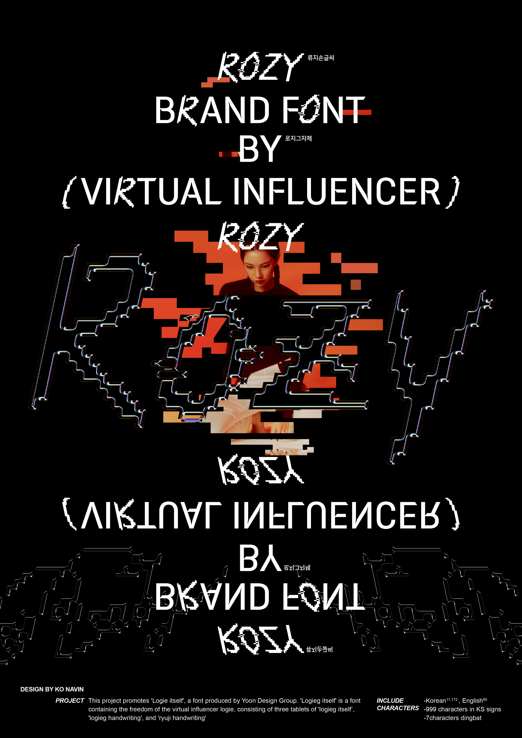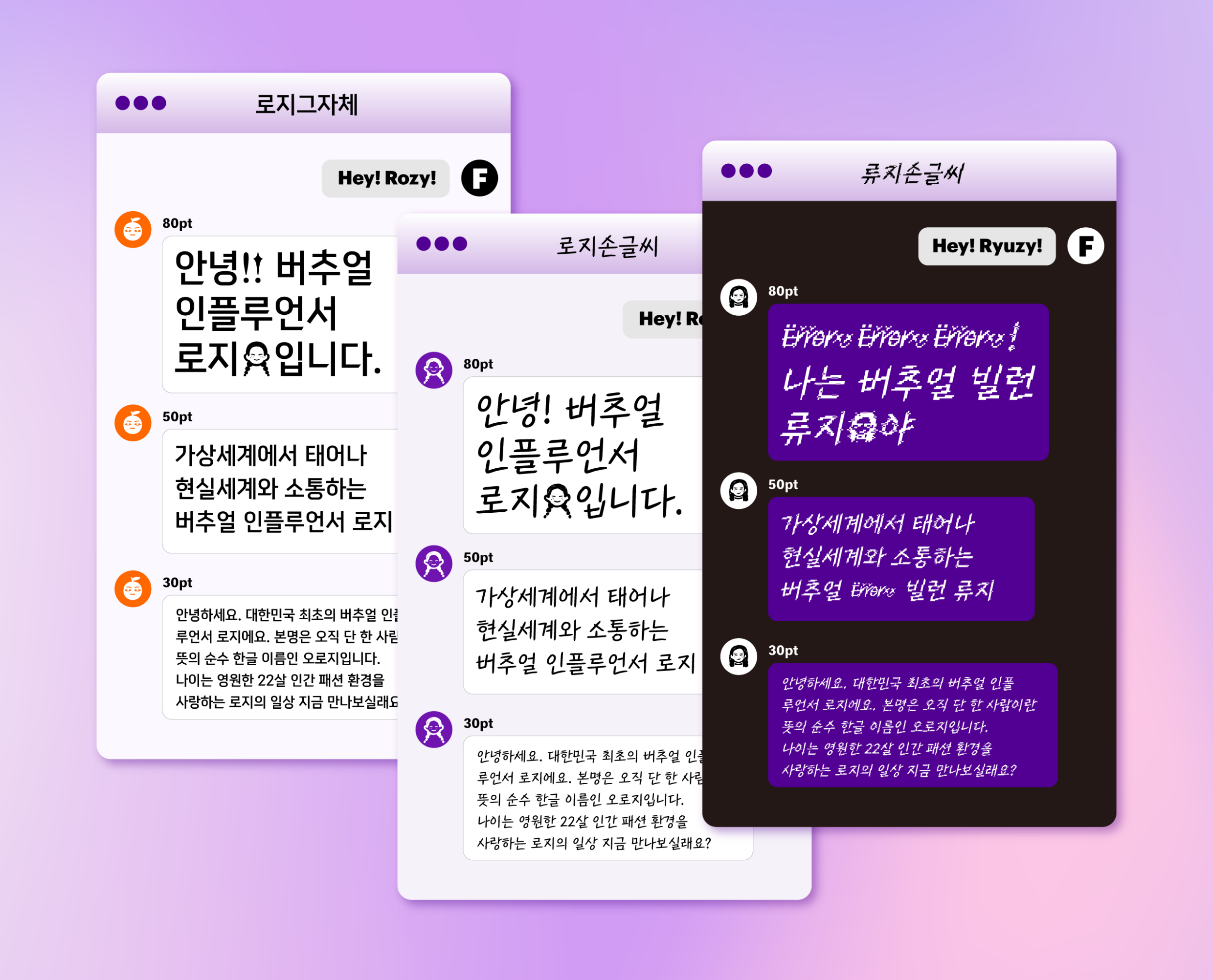 올 4월 버추얼 인플루언서 로지(Rozy)의 캐릭터 서체 「로지그자체」 3종이 공개되었습니다. 윤디자인그룹 TDC(Type Design Center)가 개발한 이 서체는 고딕 계열 「로지그자체」, 필기체 「로지손글씨」, 비트맵 스타일 「류지손글씨」로 구성되어 있습니다. 『윤디자인 M』의 [타입나누기(TYPE÷)] 코너에서 「로지그자체」를 만든 김주희 디자이너를 만나보기도 했었죠. 무료 폰트인 「로지그자체」 3종은 폰트 마켓 폰코(FONCO)의 ‘한글나눔폰트’ 컬렉션을 통해 자유롭게 사용하실 수 있습니다.