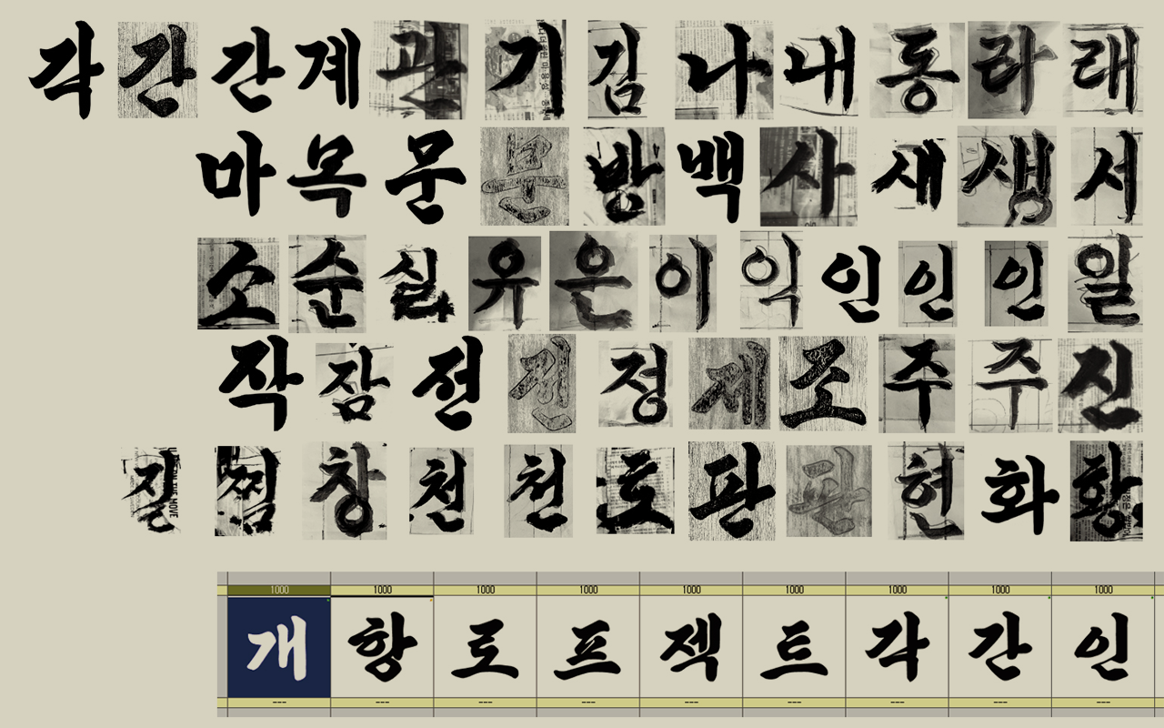 찬솔 전종원 사장님께 약간 빙의해서 사장님께서는 이렇게 글씨를 쓰시고 목간판에 옮겨 깎으셨겠구나 상상을 하는 거야. 계속 획을 살펴보고 또 쪼개고 어떻게 흐름을 가져가겠다는 것을 분석하고 상상하면서 글씨를 써갔어. 그래서 없는 글자꼴, 예를 들어 ‘박’은 있는데 ‘악’은 없다면 이응꼴은 다른 글자를 보면서 이런 흐름으로 갔겠다고 생각해서 쓰는 식으로 작업을 했던 거지. 없는 글자들이 많았는데, 일단 섞임모임꼴이 민글자 ‘화’ 하나밖에 없어서 섞임모임꼴은 거의 다 상상해서 그렸어.