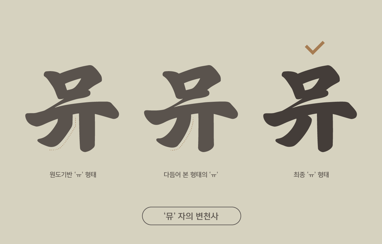 하나 재밌었던 것 중 하나가 이 ‘뮤’라는 글자가 원도 기반과 다듬어본 형태 중에서 원도 기반으로 결정됐다고 TS 서체 개발기에서 봤는데, 실제로 나온 ‘뮤’는 또 다르더라고.