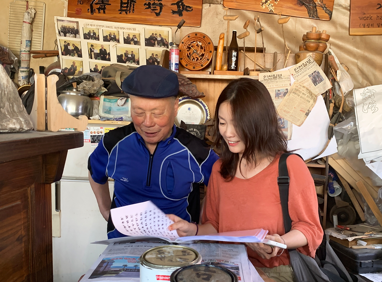 먼저 들른 곳은 개항로체 원도 작가이자 개항로에서 오랫동안 목간판을 만들어온 전종원 사장님의 가게, 전원공예사. 가게에 들어서자마자 풍겨오는 짙은 나무 냄새에는 무수한 시간이 켜켜이 쌓여 고스란히 새겨져 있었다. 강인한 글씨와는 다르게 푸근한 미소로 맞아주시는 전종원 사장님께 서체 견본집과 함께 서체가 무사히 출시되었음에 감사한 마음을 전해드렸다.