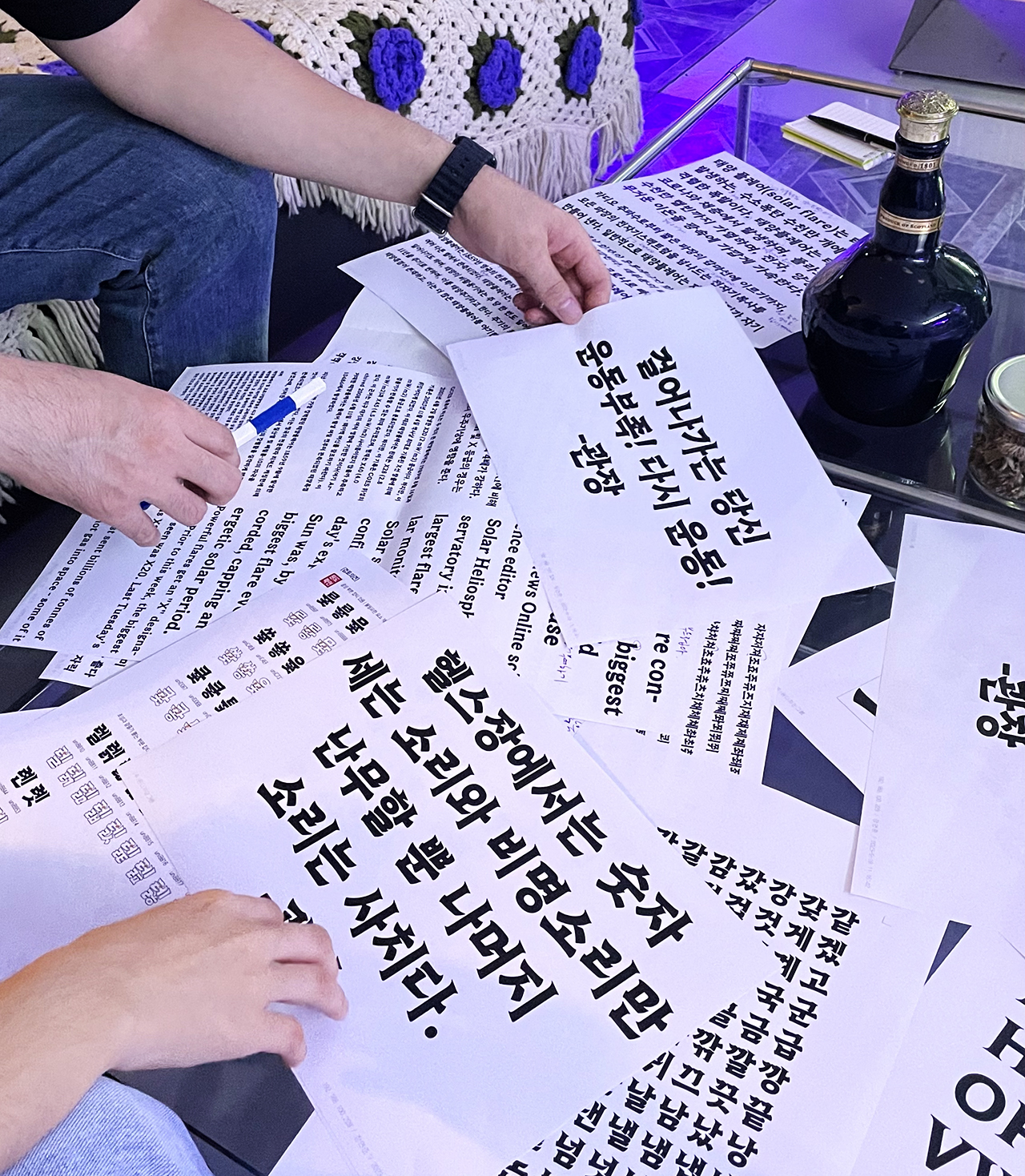 연준 맞아, 있어. 사무실에 옛날 레터링들이 담겨 있는 엄청 두꺼운 파란 책(=『한글 레터링 자료집 1950-1985』, 프로파간다) 있잖아. 거기서 어떤 글자를 발견했는데, 세로획 보고 폰트로 만들면 되게 멋있겠다고 생각했거든. 그래서 똑같이 만들면 당연히 안 되니까 세로획의 형태는 참고하되, 구조나 다른 자소들의 형태를 달리해서 초월체를 만들게 된 거야.