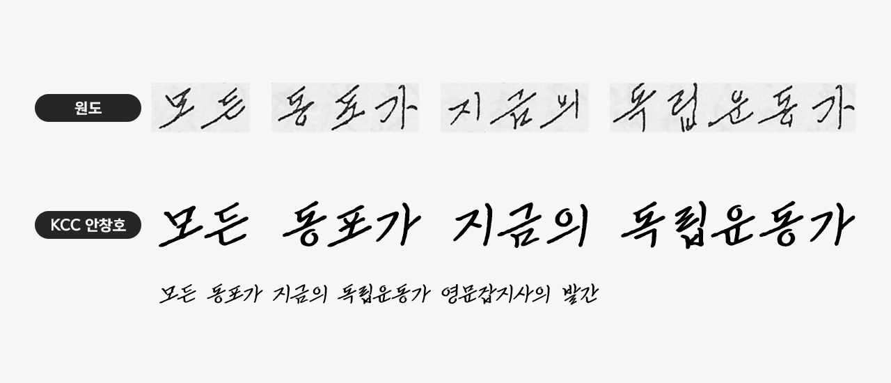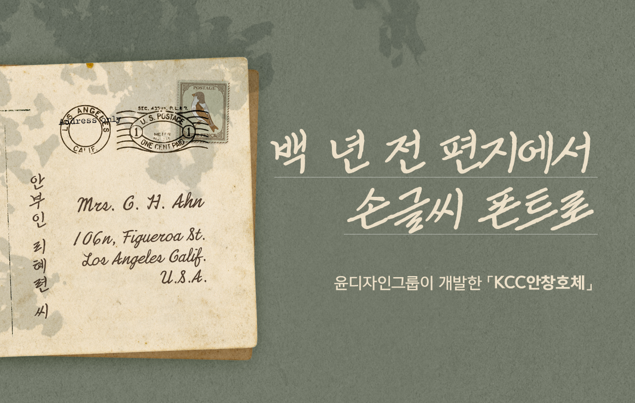 윤디자인그룹은 문화체육관광부와 한국저작권위원회의 손글씨 폰트 제작 사업에 참여하여 「KCC안창호체」를 개발했습니다. 그동안 손글씨 폰트를 비롯해 수많은 서체를 디자인하고 개발해왔지만, 이번 안창호체는 윤디자인으로서도 특별한 프로젝트였습니다.