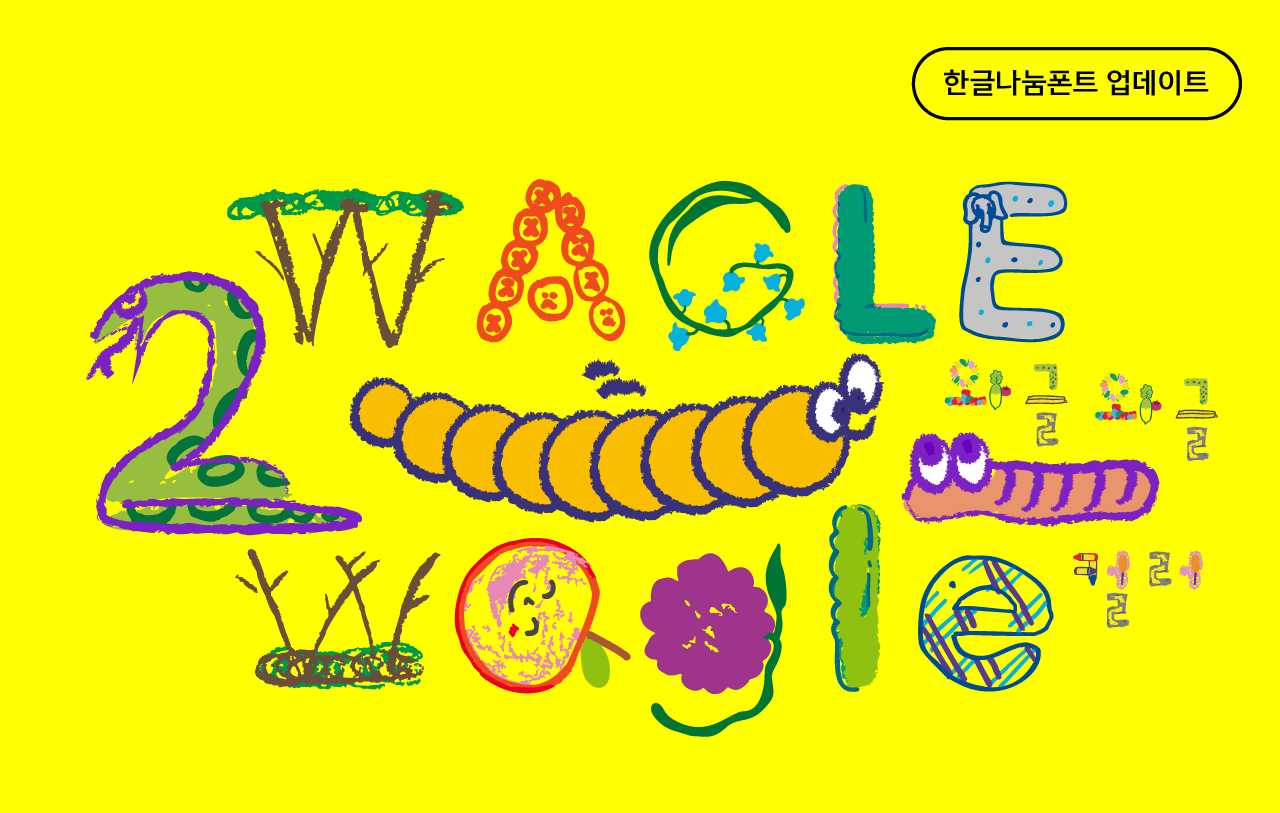 토끼, 무당벌레, 수박 등 저마다 개성 넘치는 글자들을 조합하여 엉뚱상상은 컬러와 질감이 살아있는 폰트, 와글와글체를 제작했습니다. 특히, 이 과정은 1989년부터 한글 폰트 문화와 기술을 이끌어온 윤디자인그룹이 함께했기에 가능했습니다. 11,172자라는 한글의 방대한 글자 수와 용량 때문에 폰트에 컬러와 질감을 넣기는 굉장히 어려운데요, 오랜 경력의 폰트 엔지니어의 개발 작업을 통해 국내 최초로 다채로운 컬러와 질감 그리고 글자꼴을 모두 지닌 와글와글체를 완성한 것입니다.