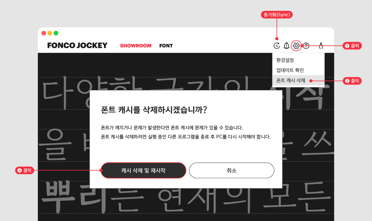 사용 방법 : 설정 아이콘 > 폰트 캐시 삭제 > 캐시 삭제 및 재시작 클릭