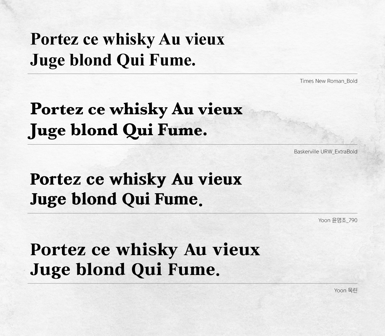 우빈: 영문 서체 레퍼런스는 역사적 맥락을 고려했어. 명조체가 글씨에서 활자시대로 갈 때 나타난 특징들이 명조체의 가장 큰 아이덴티티라면 영문에서 역시 글씨에서 활자로 넘어갈 때 작도된 인상을 조금 더 한 트랜지셔널, 과도기적 세리프가 여기에 딱 맞는다는 생각이 들었어. 가장 대표적인 게 바스커빌, 타임즈를 가장 많이 참고했던 것 같아.