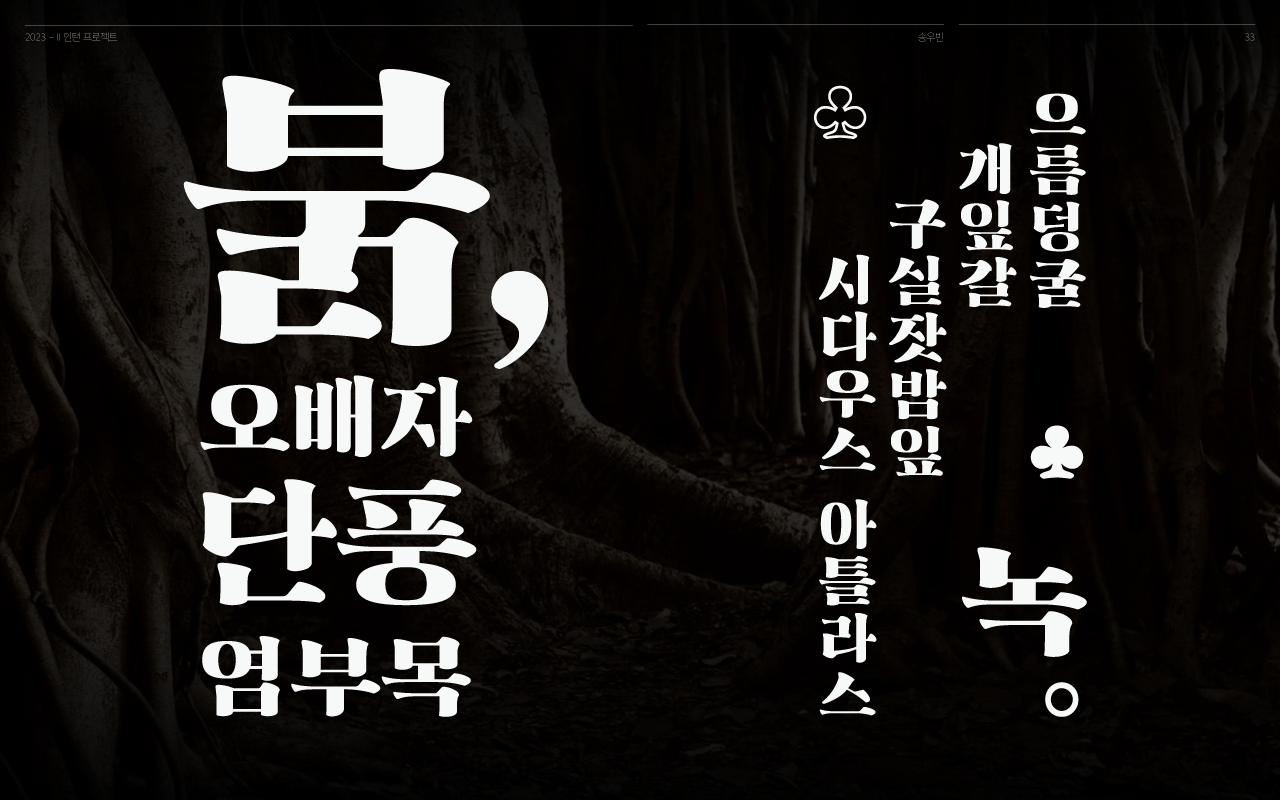 우빈: 아, 그러네? 전혀 의도한 건 아니었어. 그 시를 선택한 건 시의 내용과 목린 폰트의 콘셉트과 형태를 연결짓기 보다는 내가 좋아하는 더미 텍스트 중에 골랐는데, 그 시에서 느껴지는 난해함과 중립적인 느낌이 좋았어.