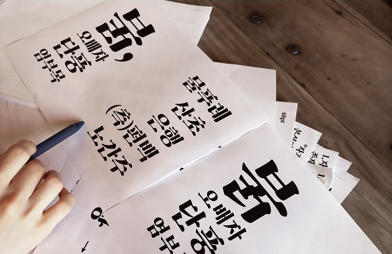 우빈: 패밀리 구성에 대한 걸 고민해보고 싶어. 초기 기획할 때 염두에 뒀던 세로쓰기 버전과 같이, 웨이트 확장 보다는 다양한 사용 환경에 적합한 패밀리를 만들어 보고 싶어. 형태적인 부분에 있어서 아직까지는 수정하고 싶은 부분은 없어.