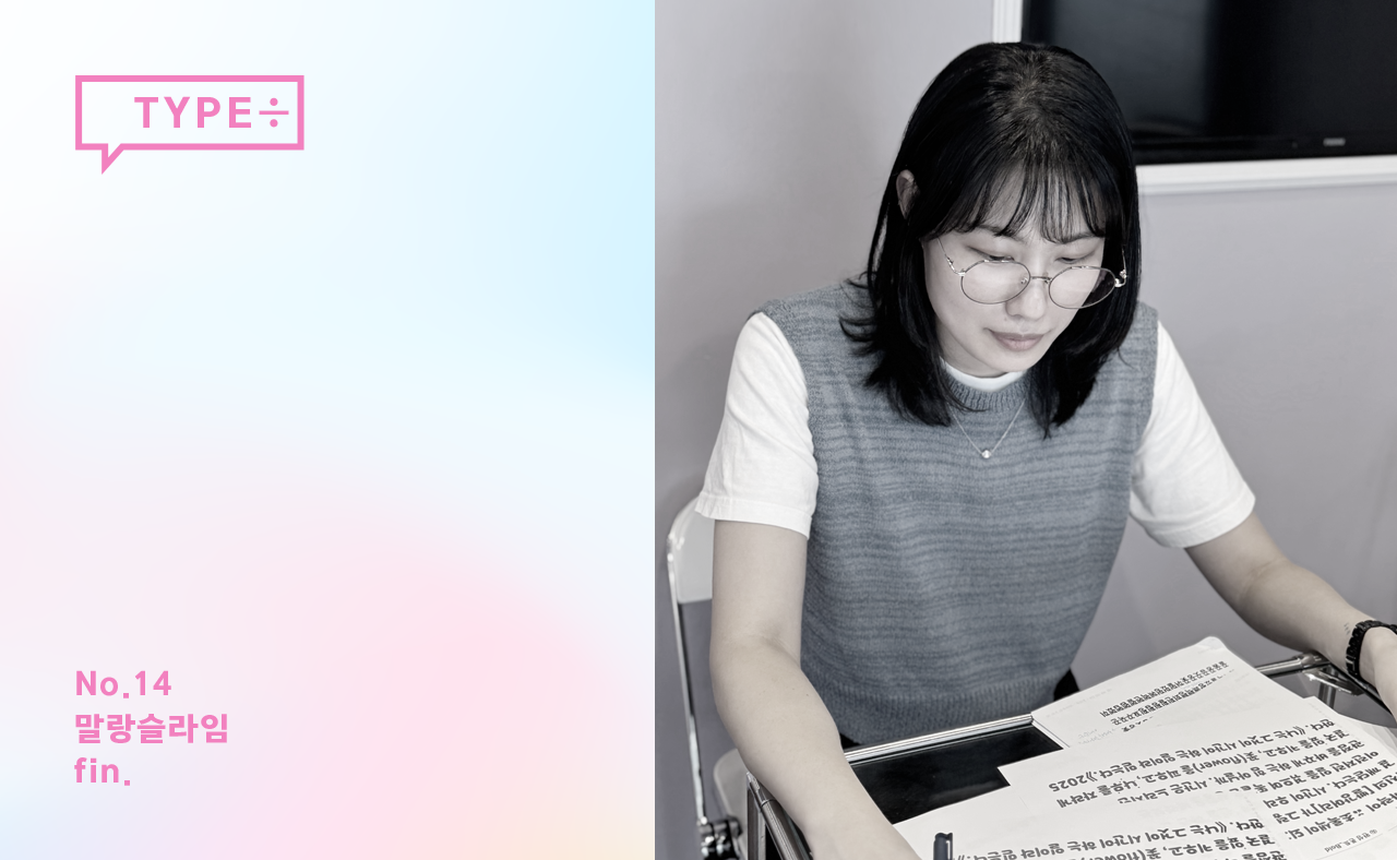연재 콘텐츠 [TYPE÷](타입나누기)는 윤디자인 TDC(Type Design Center)가 제작하여 새로 출시한 서체, 즉 타입(type)에 관해 나눈 타입 디자이너들의 스몰토크입니다. 서체를 만든 담당 디자이너의 영감과 제작 의도, 비하인드 스토리, 그리고 동료 디자이너들의 관점은 또 어떨지. 하나의 서체를 주제로 그 서체와 어울리는 공간에서 타입 디자이너들이 대화를 나누고 이를 기록하여 들려드립니다.