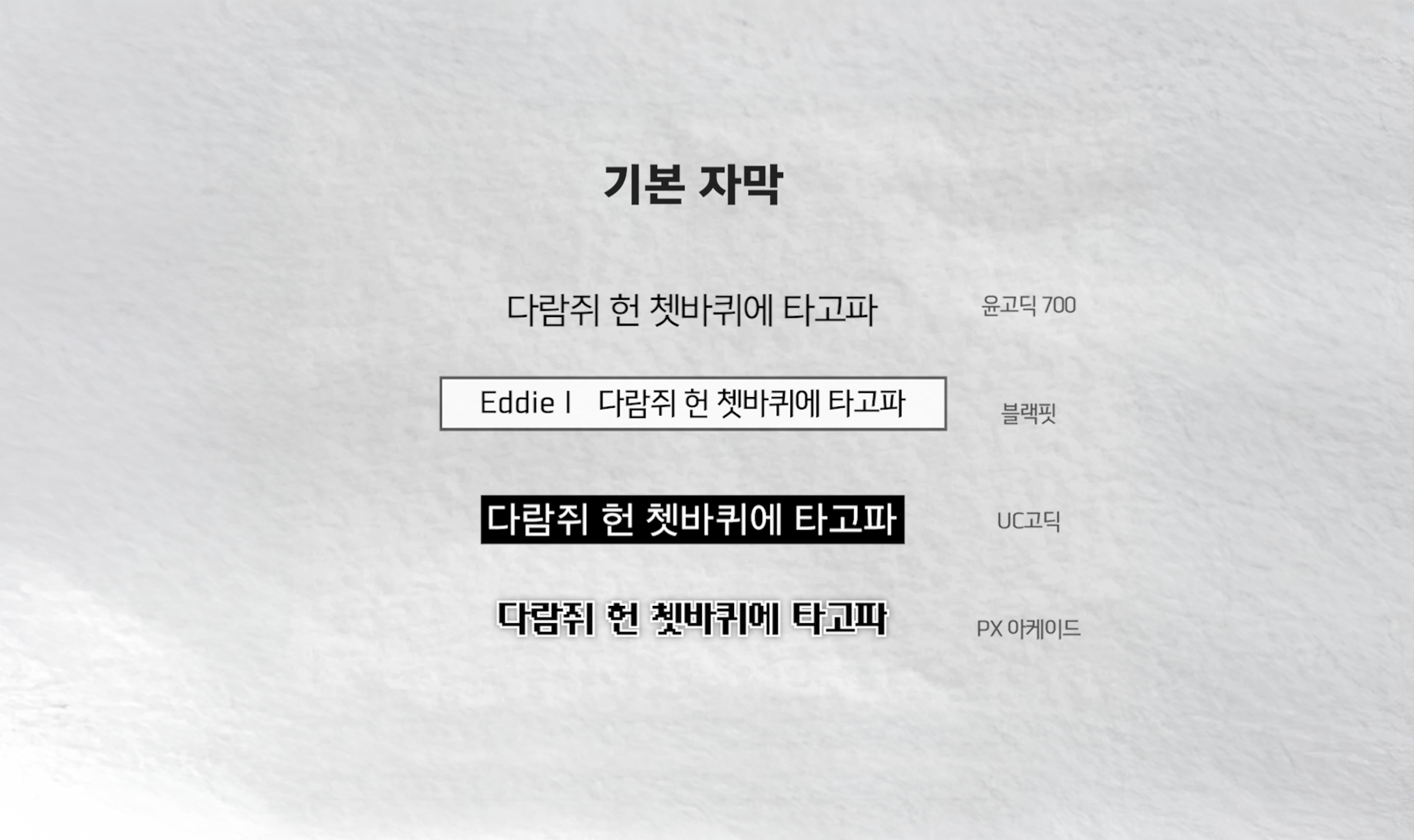 영상에서 가장 많이 쓰이는 기본 자막. 깔끔하고 시인성 높은 고딕체 중심.