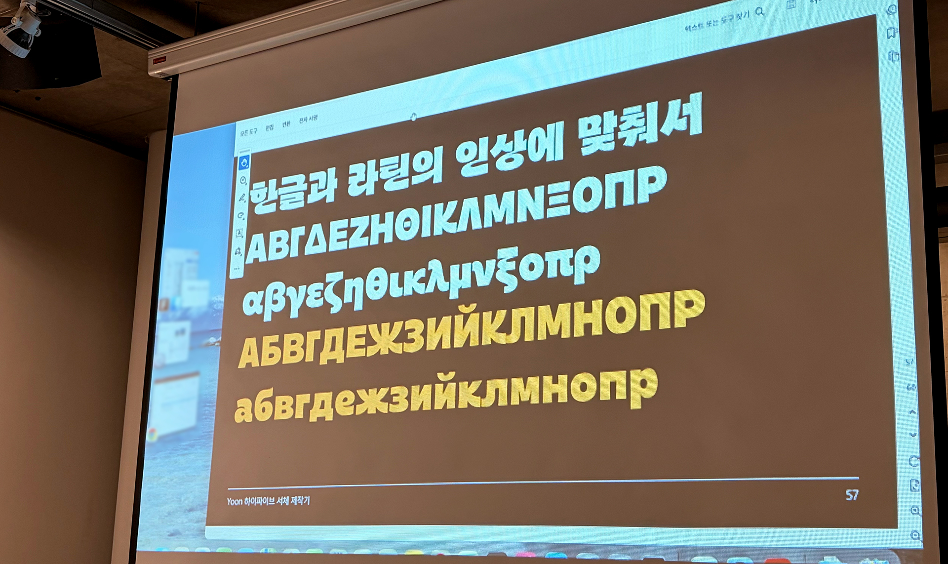 서체 리뷰 세션에서는 「Yoon 그리모어(Grimoire)」와 「Yoon 하이파이브(Highfive)」의 디자인 콘셉트와 제작 과정이 소개되었습니다. 특히 타입 디자이너들은 윤디자인 폰트에 포함된 키릴 문자 디자인의 완성도와 활용성에 대해 러시아 참가자들과 활발히 의견을 나누었습니다.